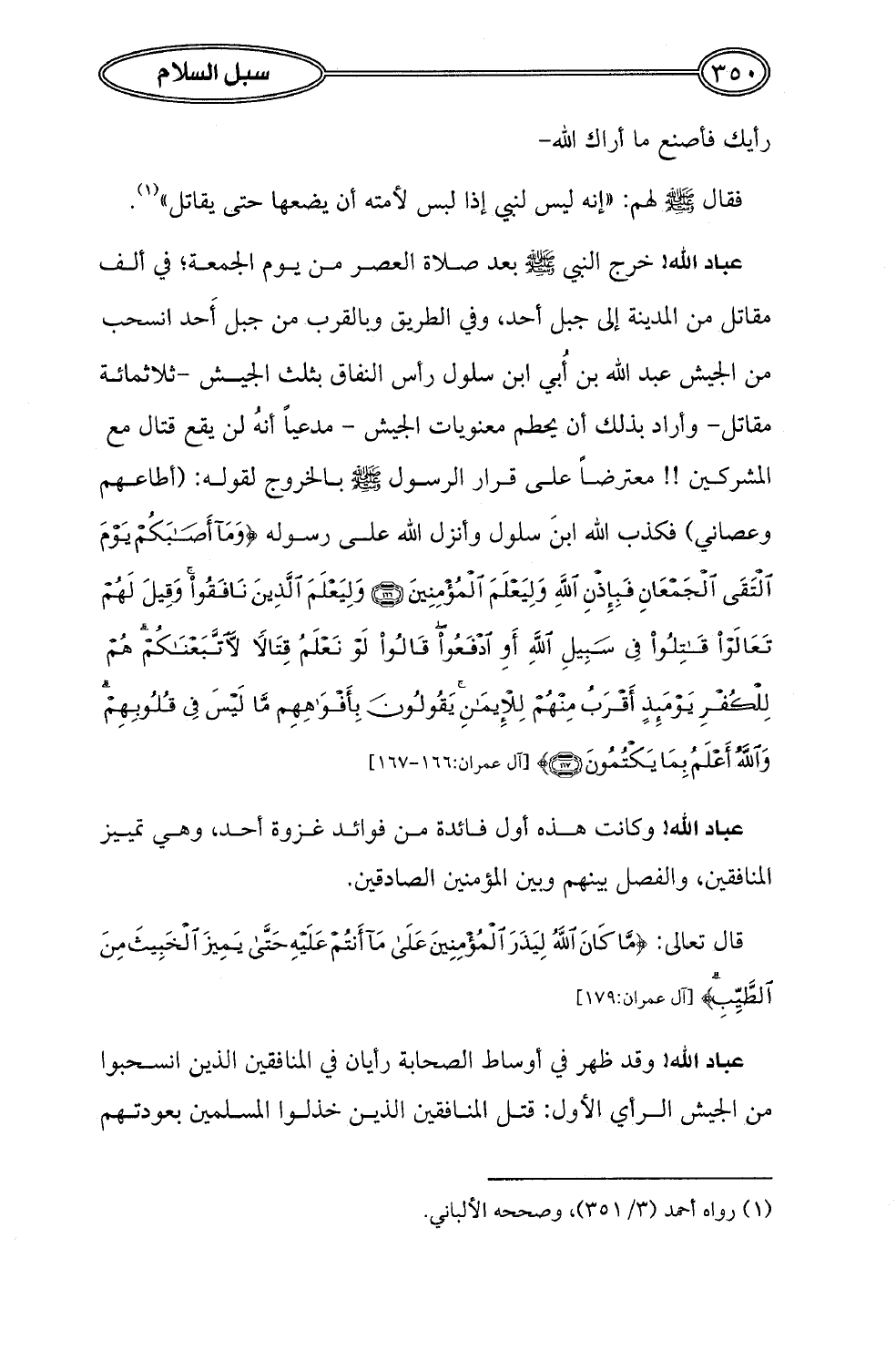 عباد الله! خرج النبي - صلى الله عليه وسلم - بعد صلاة العصر من يوم الجمعة؛ في ألف مقاتل من المدينة إلى جبل أحد، وفي الطريق وبالقرب من جبل أحد انسحب من الجيش عبد الله بن أُبي ابن سلول رأس النفاق بثلث الجيش -ثلاثمائة مقاتل- وأراد بذلك أن يحطم معنويات الجيش- مدعياً أنهُ لن يقع قتال مع المشركين!! معترضاً على قرار الرسول - صلى الله عليه وسلم - بالخروج لقوله: (أطاعهم وعصاني) فكذب الله ابنَ سلول وأنزل الله على رسوله {وَمَا أَصَابَكُمْ يَوْمَ الْتَقَى الْجَمْعَانِ فَبِإِذْنِ اللَّهِ وَلِيَعْلَمَ الْمُؤْمِنِينَ (166) وَلِيَعْلَمَ الَّذِينَ نَافَقُوا وَقِيلَ لَهُمْ تَعَالَوْا قَاتِلُوا فِي سَبِيلِ اللَّهِ أَوِ ادْفَعُوا قَالُوا لَوْ نَعْلَمُ قِتَالًا لَاتَّبَعْنَاكُمْ هُمْ لِلْكُفْرِ يَوْمَئِذٍ أَقْرَبُ مِنْهُمْ لِلْإِيمَانِ يَقُولُونَ بِأَفْوَاهِهِمْ مَا لَيْسَ فِي قُلُوبِهِمْ وَاللَّهُ أَعْلَمُ بِمَا يَكْتُمُونَ (167)} [آل عمران: 166 - 167]