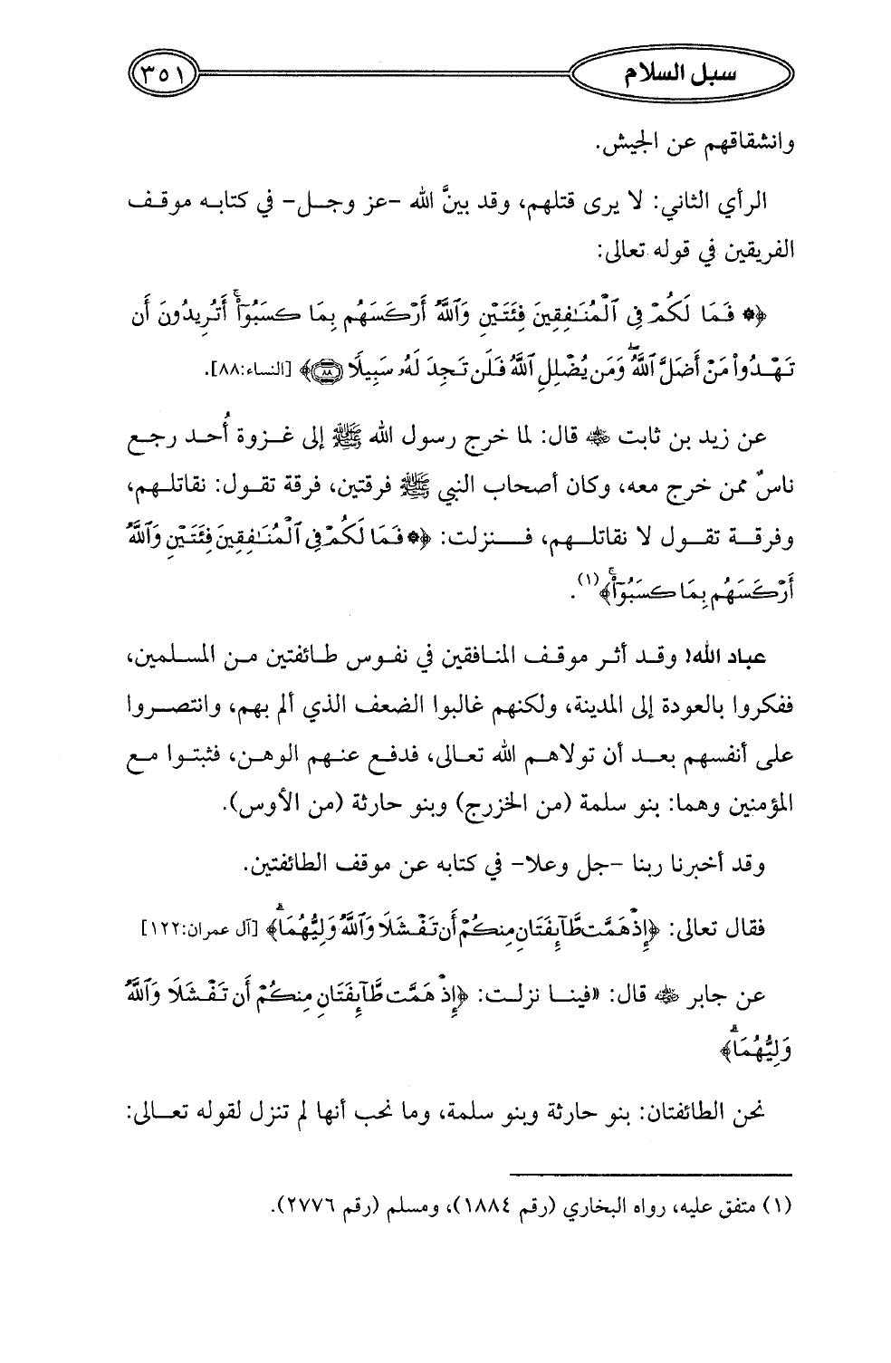 عن زيد بن ثابت - رضي الله عنه - قال: لما خرج رسول الله - صلى الله عليه وسلم - إلى غزوة أُحد رجع ناسٌ ممن خرج معه، وكان أصحاب النبي - صلى الله عليه وسلم - فرقتين، فرقة تقول: نقاتلهم، وفرقة تقول لا نقاتلهم، فنزلت: {فَمَا لَكُمْ فِي الْمُنَافِقِينَ فِئَتَيْنِ وَاللَّهُ أَرْكَسَهُمْ بِمَا كَسَبُوا} (¬1).