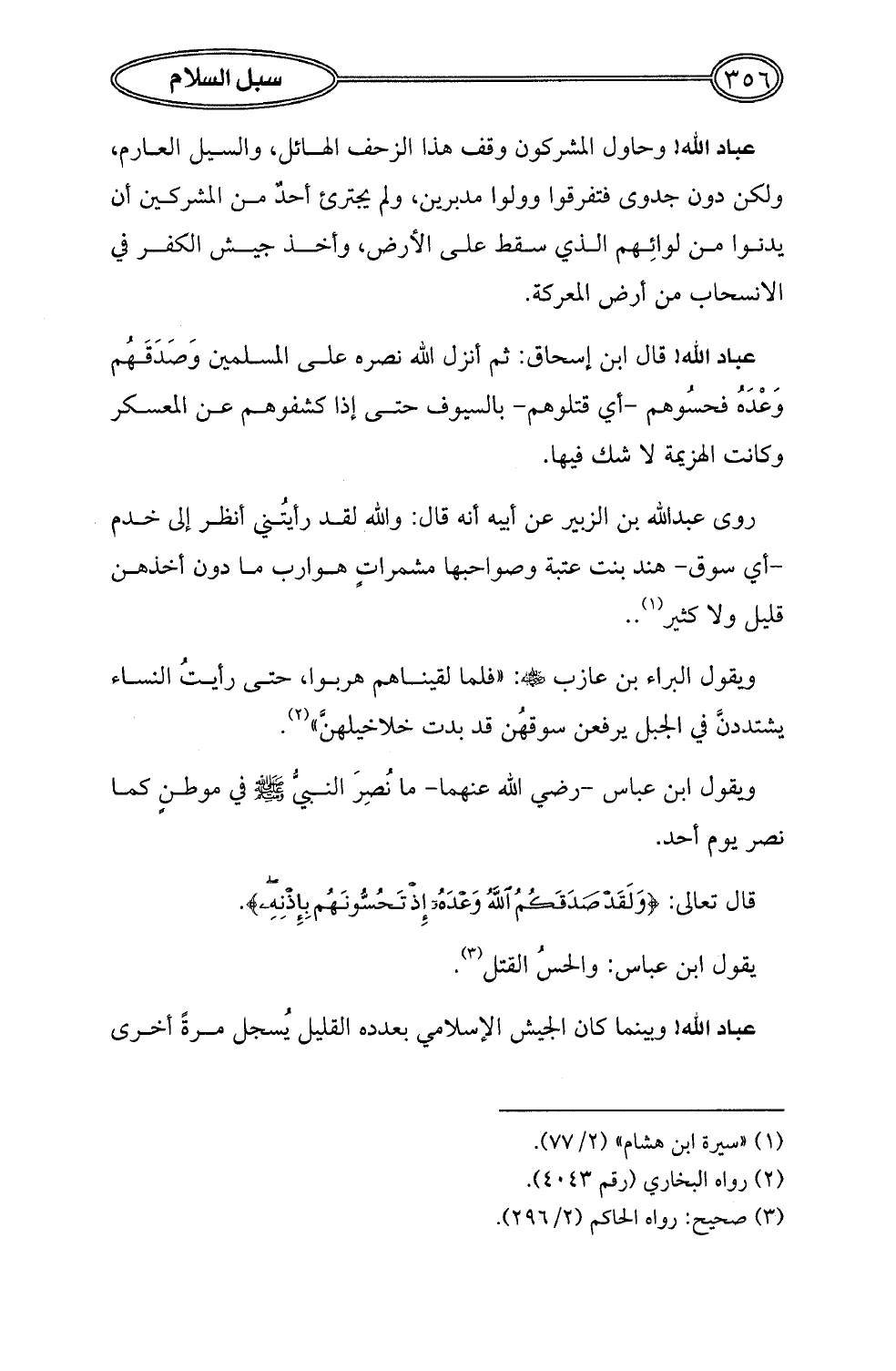 عباد الله! قال ابن إسحاق: ثم أنزل الله نصره على المسلمين وَصَدَقَهُم وَعْدَهُ فحسُوهم -أي قتلوهم- بالسيوف حتى إذا كشفوهم عن المعسكر وكانت الهزيمة لا شك فيها.