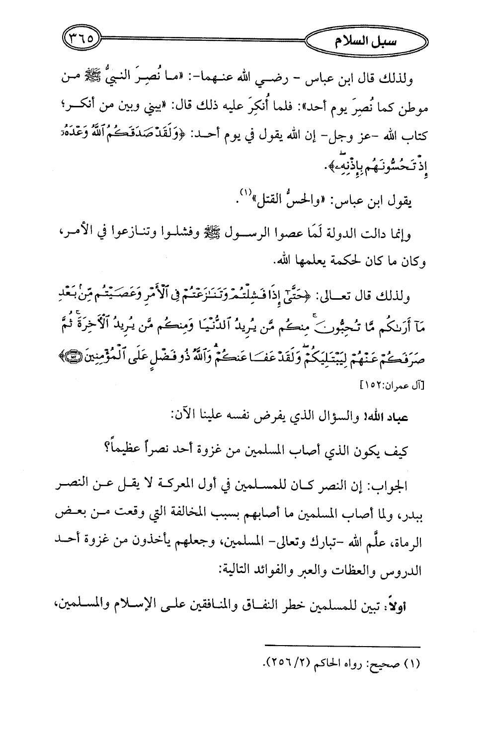 ولذلك قال ابن عباس -رضي الله عنهما-: "ما نُصِرَ النبي - صلى الله عليه وسلم - من موطن كما نُصِرَ يوم أحد": فلما أُنكِرَ عليه ذلك قال: "بيني وبين من أنكر؛ كتاب الله -عز وجل- إن الله يقول في يوم أحد: {وَلَقَدْ صَدَقَكُمُ اللَّهُ وَعْدَهُ إِذْ تَحُسُّونَهُمْ بِإِذْنِهِ}.