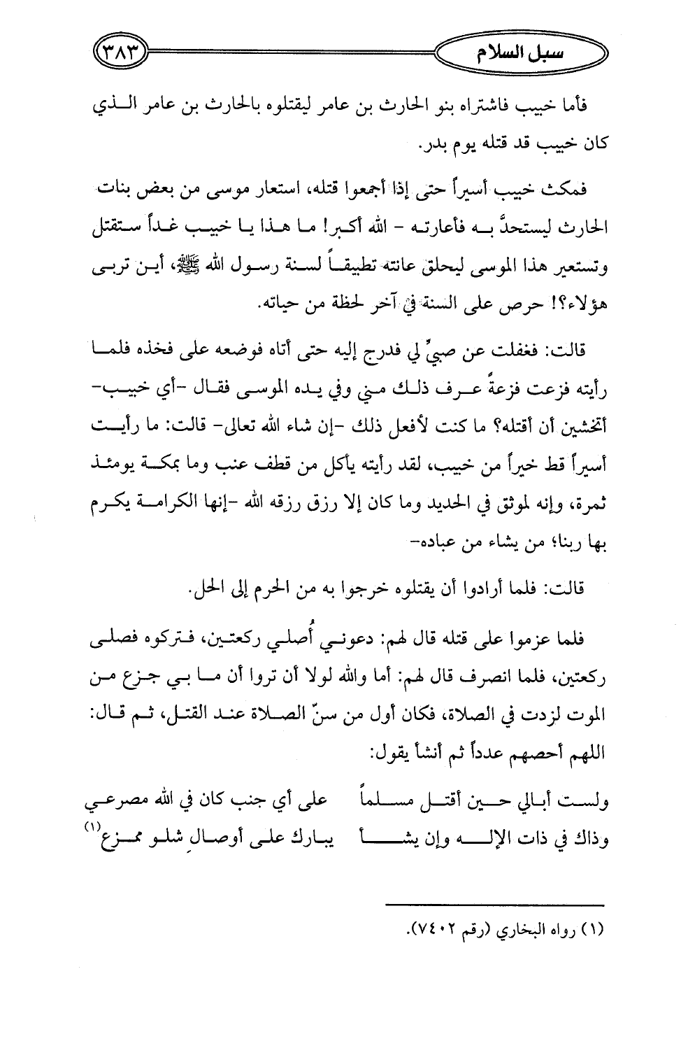 فمكث خبيب أسيراً حتى إذا أجمعوا قتله، استعار موسى من بعض بنات الحارث ليستحدَّ به فأعارته- الله أكبر! ما هذا يا خبيب غداً ستقتل وتستعير هذا الموسى ليحلق عانته تطبيقاً لسنة رسول الله- صلى الله عليه وسلم -، أين تربى هؤلاء؟! حرص على السنة في آخر لحظة من حياته.