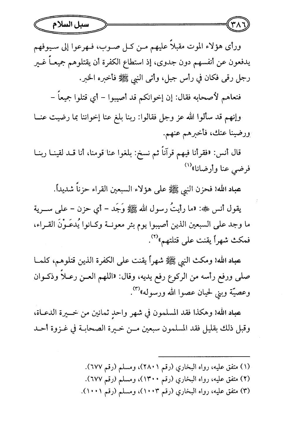 يقول أنس - رضي الله عنه -: "ما رأيتُ رسول الله- صلى الله عليه وسلم - وَجَد -أي حزن- على سرية ما وجد على السبعين الذين أصيبوا يوم بئر معونة وكانوا يُدعَوْنَ القراء، فمكث شهراً يقنت على قتلتهم" (¬2).