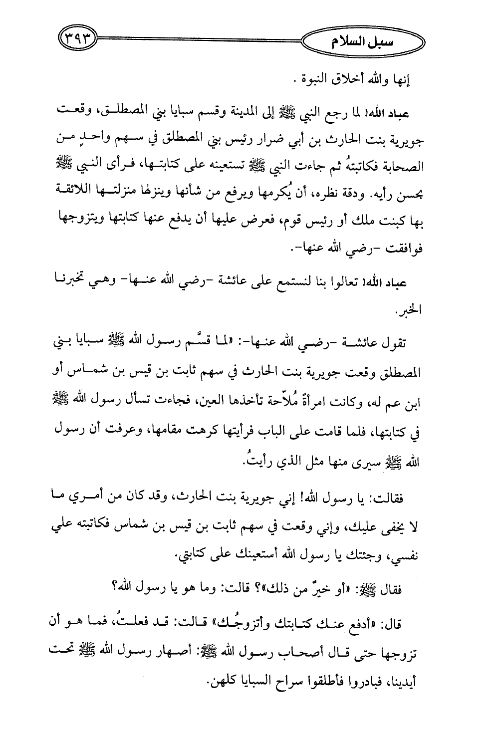 قال: "أدفع عنك كتابتك وأتزوجُك" قالت: قد فعلتُ، فما هو أن تزوجها حتى قال أصحاب رسول الله - صلى الله عليه وسلم -: أصهار رسول الله - صلى الله عليه وسلم - تحت أيدينا، فبادروا فأطلقوا سراح السبايا كلهن.