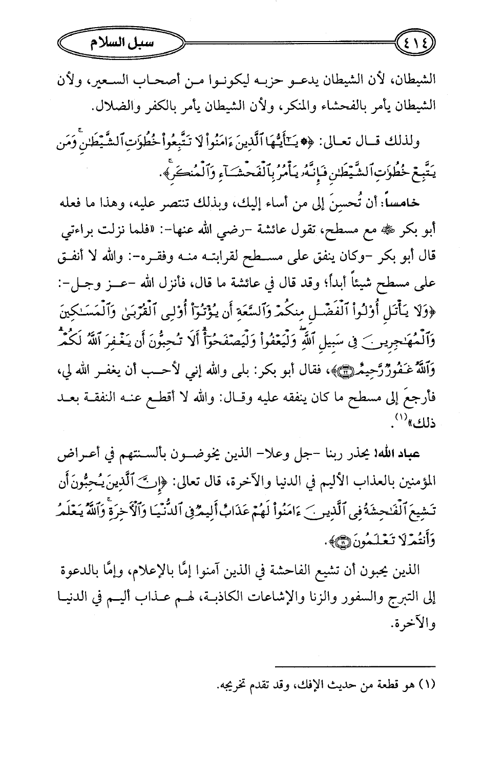 خامساً: أن تُحسِنَ إلى من أساء إليك، وبذلك تنتصر عليه، وهذا ما فعله أبو بكر - رضي الله عنه - مع مسطح، تقول عائشة -رضي الله عنها-: "فلما نزلت براءتي قال أبو بكر- وكان ينفق على مسطح لقرابته منه وفقره-: والله لا أنفق على مسطح شيئاً أبداً؛ وقد قال في عائشة ما قال، فأنزل الله -عز وجل-: {وَلَا يَأْتَلِ أُولُو الْفَضْلِ مِنْكُمْ وَالسَّعَةِ أَنْ يُؤْتُوا أُولِي الْقُرْبَى وَالْمَسَاكِينَ وَالْمُهَاجِرِينَ فِي سَبِيلِ اللَّهِ وَلْيَعْفُوا وَلْيَصْفَحُوا أَلَا تُحِبُّونَ أَنْ يَغْفِرَ اللَّهُ لَكُمْ وَاللَّهُ غَفُورٌ رَحِيمٌ (22)}، فقال أبو بكر: بلى والله إني لأحب أن يغفر الله لي، فأرجعَ إلى مسطح ما كان ينفقه عليه وقال: والله لا أقطع عنه النفقة بعد ذلك" (¬1).