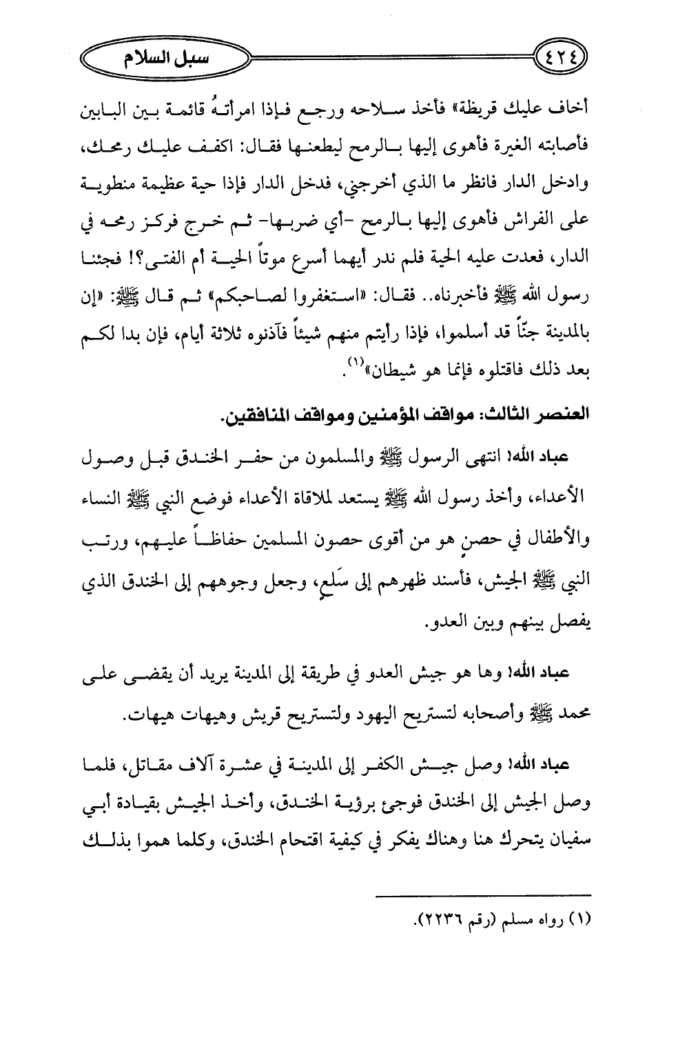 أخاف عليك قريظة" فأخذ سلاحه ورجع فإذا امرأتهُ قائمة بين البابين فأصابته الغيرة فأهوى إليها بالرمح ليطعنها فقال: اكفف عليك رمحك، وادخل الدار فانظر ما الذي أخرجني، فدخل الدار فإذا حية عظيمة منطوية على الفراش فأهوى إليها بالرمح -أي ضربها- ثم خرج فركز رمحه في الدار، فعدت عليه الحية فلم ندر أيهما أسرع موتاً الحية أم الفتى؟! فجئنا رسول الله - صلى الله عليه وسلم - فأخبرناه .. فقال: "استغفروا لصاحبكم" ثم قال - صلى الله عليه وسلم -: "إن بالمدينة جناً قد أسلموا، فإذا رأيتم منهم شيئاً فآذنوه ثلاثة أيام، فإن بدا لكم بعد ذلك فاقتلوه فإنما هو شيطان" (¬1).