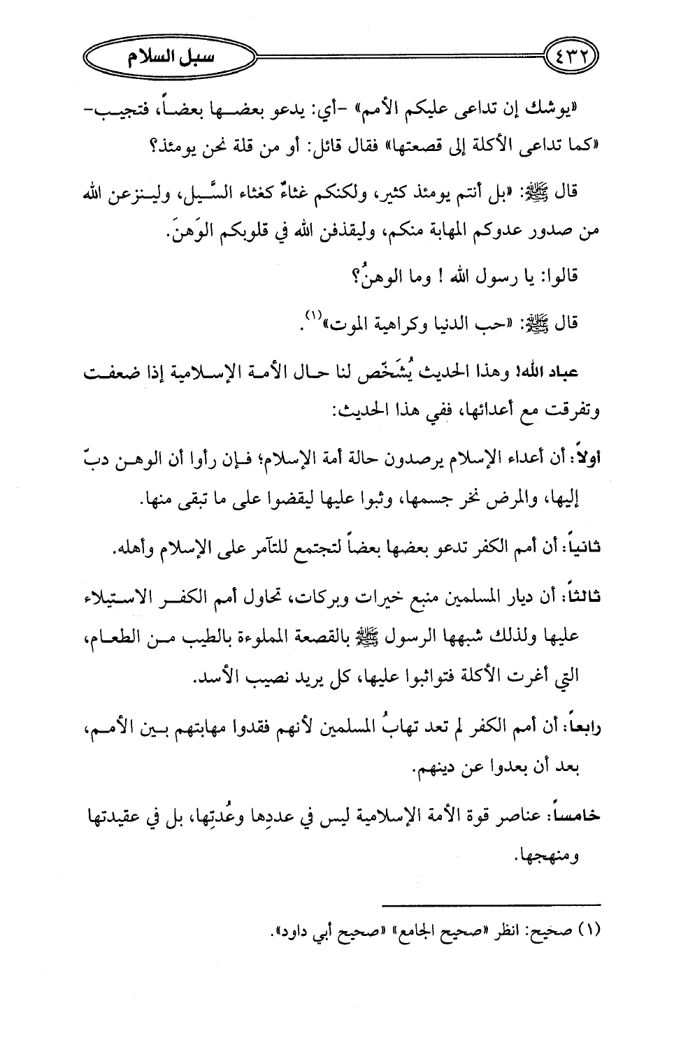 عباد الله! وهذا الحديث يُشَخّص لنا حال الأمة الإِسلامية إذا ضعفت وتفرقت مع أعدائها، ففي هذا الحديث: