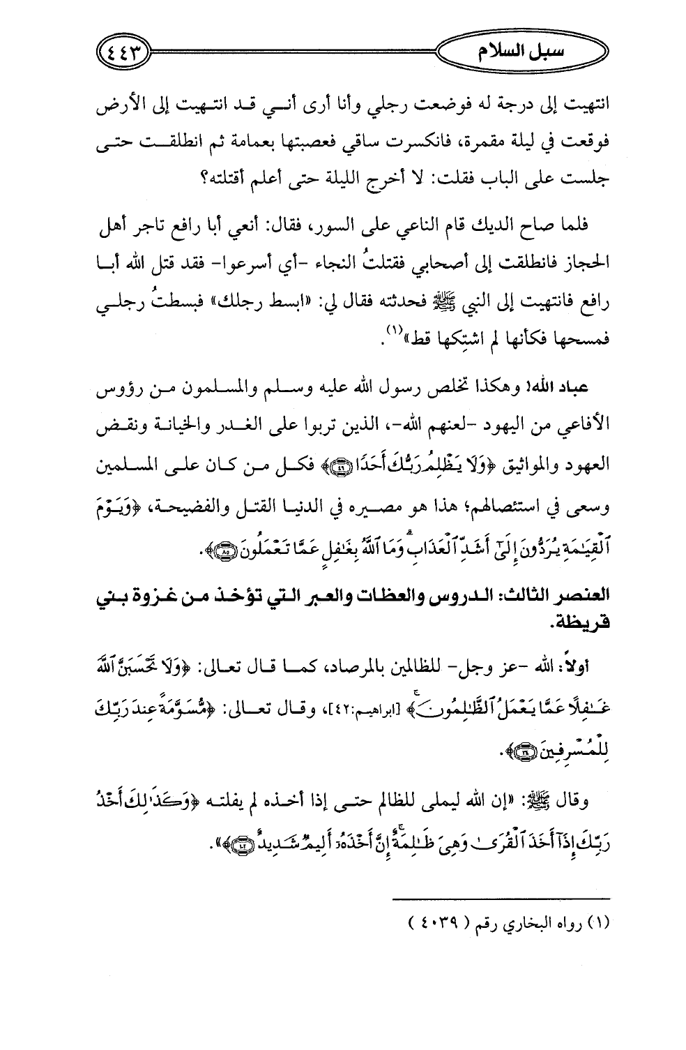 فلما صاح الديك قام الناعي على السور، فقال: أنعي أبا رافع تاجر أهل الحجاز فانطلقت إلى أصحابي فقلتُ النجاء -أي أسرعوا- فقد قتل الله أبا رافع فانتهيت إلى النبي - صلى الله عليه وسلم - فحدثته فقال لي: "ابسط رجلك" فبسطتُ رجلي فمسحها فكأنها لم أشتِكها قط" (¬1).