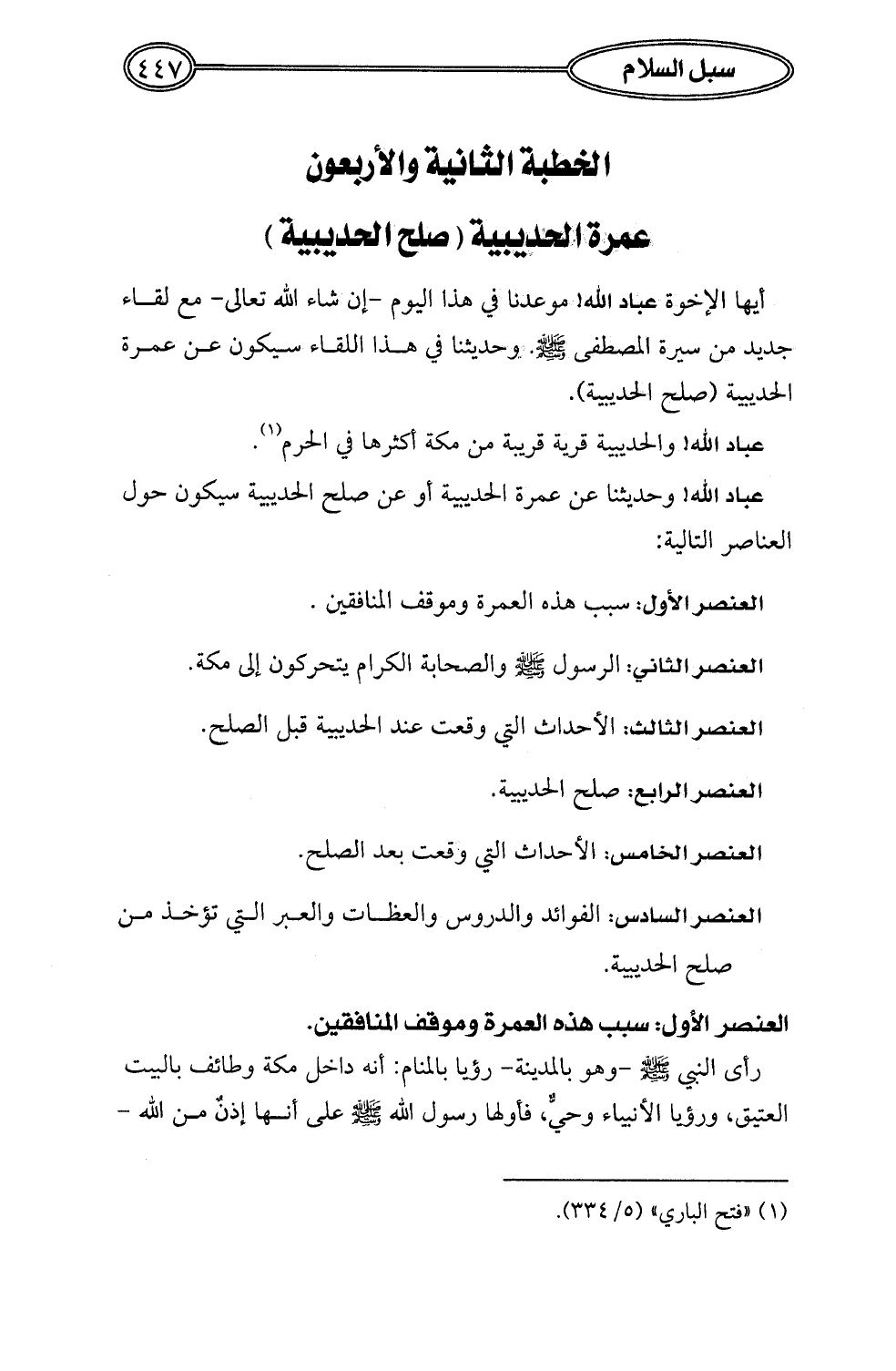 عباد الله! وحديثنا عن عمرة الحديبية أو عن صلح الحديبية سيكون حول العناصر التالية: