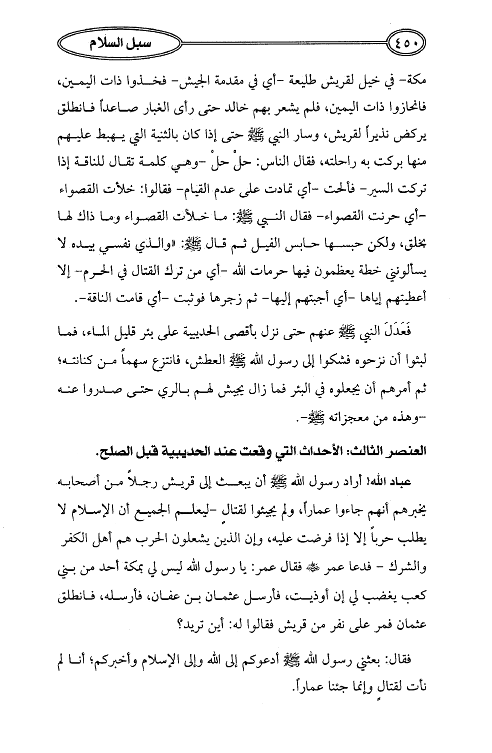 مكة- في خيل لقريش طليعة -أي في مقدمة الجيش- فخذوا ذات اليمين، فانحازوا ذات اليمين، فلم يشعر بهم خالد حتى رأى الغبار صاعداً فانطلق يركض نذيراً لقريش، وسار النبي - صلى الله عليه وسلم - حتى إذا كان بالثنية التي يهبط عليهم منها بركت به راحلته، فقال الناس: حلْ حلْ- وهي كلمة تقال للناقة إذا تركت السير- فألحت -أي تمادت على عدم القيام- فقالوا: خلأت القصواء -أي حرنت القصواء- فقال النبي - صلى الله عليه وسلم -: ما خلأت القصواء وما ذاك لها بخلق، ولكن حبسها حابس الفيل ثم قال - صلى الله عليه وسلم -: "والذي نفسي بيده لا يسألونني خطة يعظمون فيها حرمات الله -أي من ترك القتال في الحرم- إلا أعطيتهم إياها -أي أجبتهم إليها- ثم زجرها فوثبت -أي قامت الناقة-.