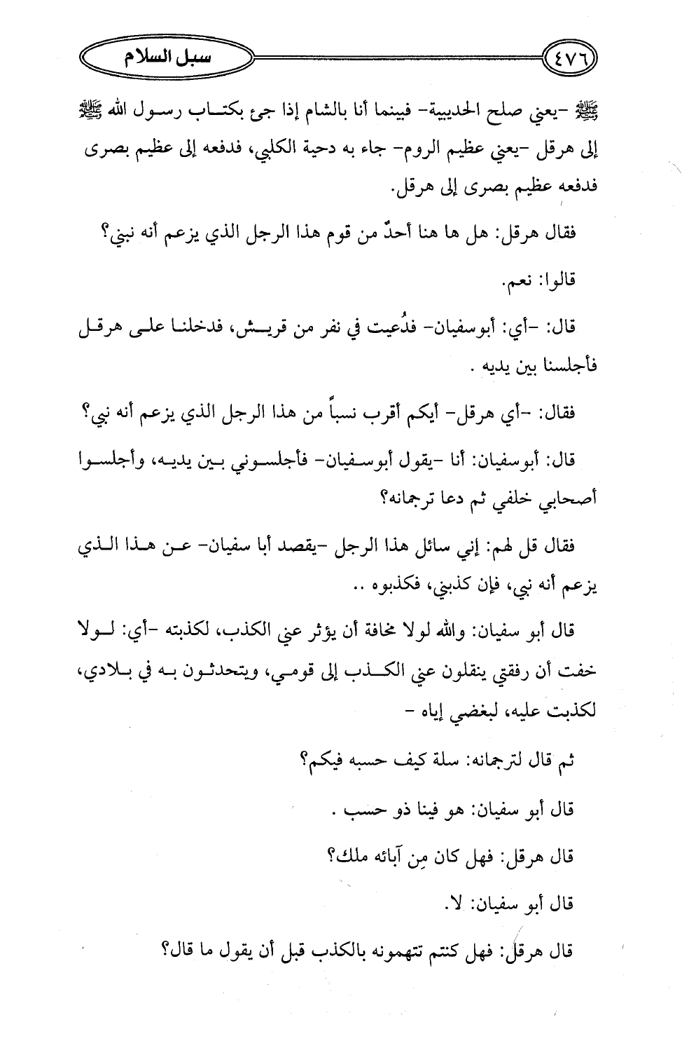 (صلى الله عليه وسلم) -يعني صلح الحديبية- فبينما أنا بالشام إذا جئ بكتاب رسول الله - صلى الله عليه وسلم - إلى هرقل -يعني عظيم الروم- جاء به دحية الكلبي، فدفعه إلى عظيم بصرى فدفعه عظيم بصرى إلى هرقل.