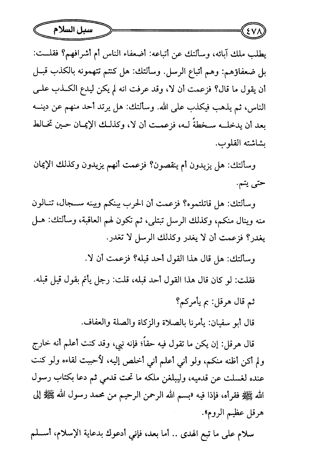 يطلب ملك آبائه، وسألتك عن أتباعه: أضعفاء الناس أم أشرافهم؟ فقلت: بل ضعفاؤهم: وهم أتباع الرسل. وسألتك: هل كنتم تتهمونه بالكذب قبل أن يقول ما قال؟ فزعمت أن لا، وقد عرفت أنه لم يكن ليدع الكذب على الناس، ثم يذهب فيكذب على الله. وسألتك: هل يرتد أحد منهم عن دينه بعد أن يدخله سخطةً له، فزعمت أن لا، وكذلك الإيمان حين تخالط بشاشته القلوب.