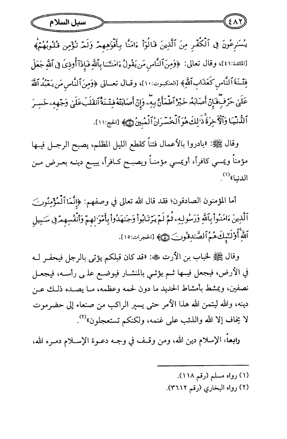 وقال - صلى الله عليه وسلم - لخباب بن الأرت - رضي الله عنه -: "قد كان قبلكم يؤتى بالرجل فيحفر له في الأرض، فيجعل فيها ثم يؤتي بالمنشار فيوضع على رأسه، فيجعل نصفين، ويمشط بأمشاط الحديد ما دون لحمه وعظمه، ما يصده ذلك عن دينه، والله ليتمن الله هذا الأمر حتى يسير الراكب من صنعاء إلى حضرموت لا يخاف إلا الله والذئب على غنمه، ولكنكم تستعجلون" (¬2).