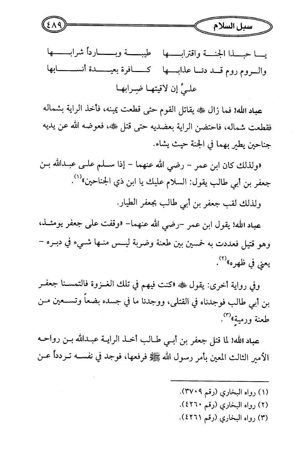 "ولذلك كان ابن عمر -رضي الله عنهما- إذا سلم على عبد الله بن جعفر بن أبي طالب يقول: السلام عليك يا ابن ذي الجناحين" (¬1).