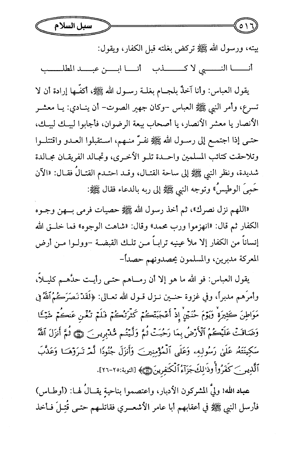 يقول العباس: فوالله ما هو إلا أن رماهم حتى رأيت حدَّهم كليلاً، وأمرَهم مدبراً، وفي غزوة حنين نزل قول الله تعالى: {لَقَدْ نَصَرَكُمُ اللَّهُ فِي مَوَاطِنَ كَثِيرَةٍ وَيَوْمَ حُنَيْنٍ إِذْ أَعْجَبَتْكُمْ كَثْرَتُكُمْ فَلَمْ تُغْنِ عَنْكُمْ شَيْئًا وَضَاقَتْ عَلَيْكُمُ الْأَرْضُ بِمَا رَحُبَتْ ثُمَّ وَلَّيْتُمْ مُدْبِرِينَ (25) ثُمَّ أَنْزَلَ اللَّهُ سَكِينَتَهُ عَلَى رَسُولِهِ وَعَلَى الْمُؤْمِنِينَ وَأَنْزَلَ جُنُودًا لَمْ تَرَوْهَا وَعَذَّبَ الَّذِينَ كَفَرُوا وَذَلِكَ جَزَاءُ الْكَافِرِينَ (26)} [التوبة: 25 - 26].