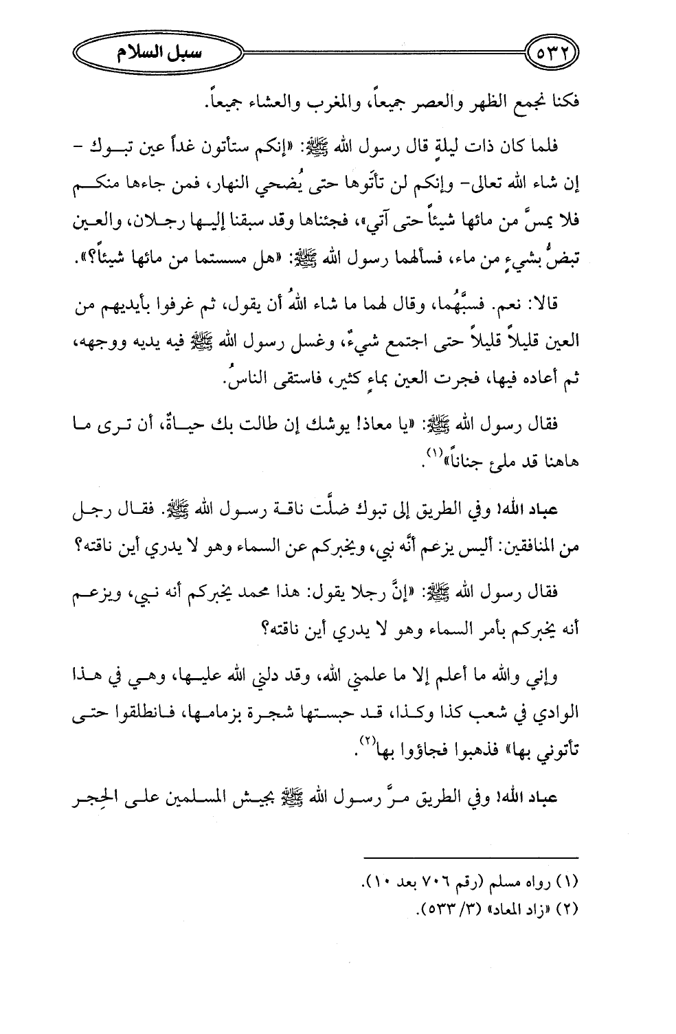 فلما كان ذات ليلةٍ قال رسول الله - صلى الله عليه وسلم -: "إنكم ستأتون غداً عين تبوك- إن شاء الله تعالى- وإنكم لن تأتوها حتى يُضحي النهار، فمن جاءها منكم فلا يمسَّ من مائها شيئاً حتى آتي"، فجئناها وقد سبقنا إليها رجلان، والعين تبضُّ بشيءٍ من ماء، فسألهما رسول الله- صلى الله عليه وسلم -: "هل مسستما من مائها شيئاً؟ ".