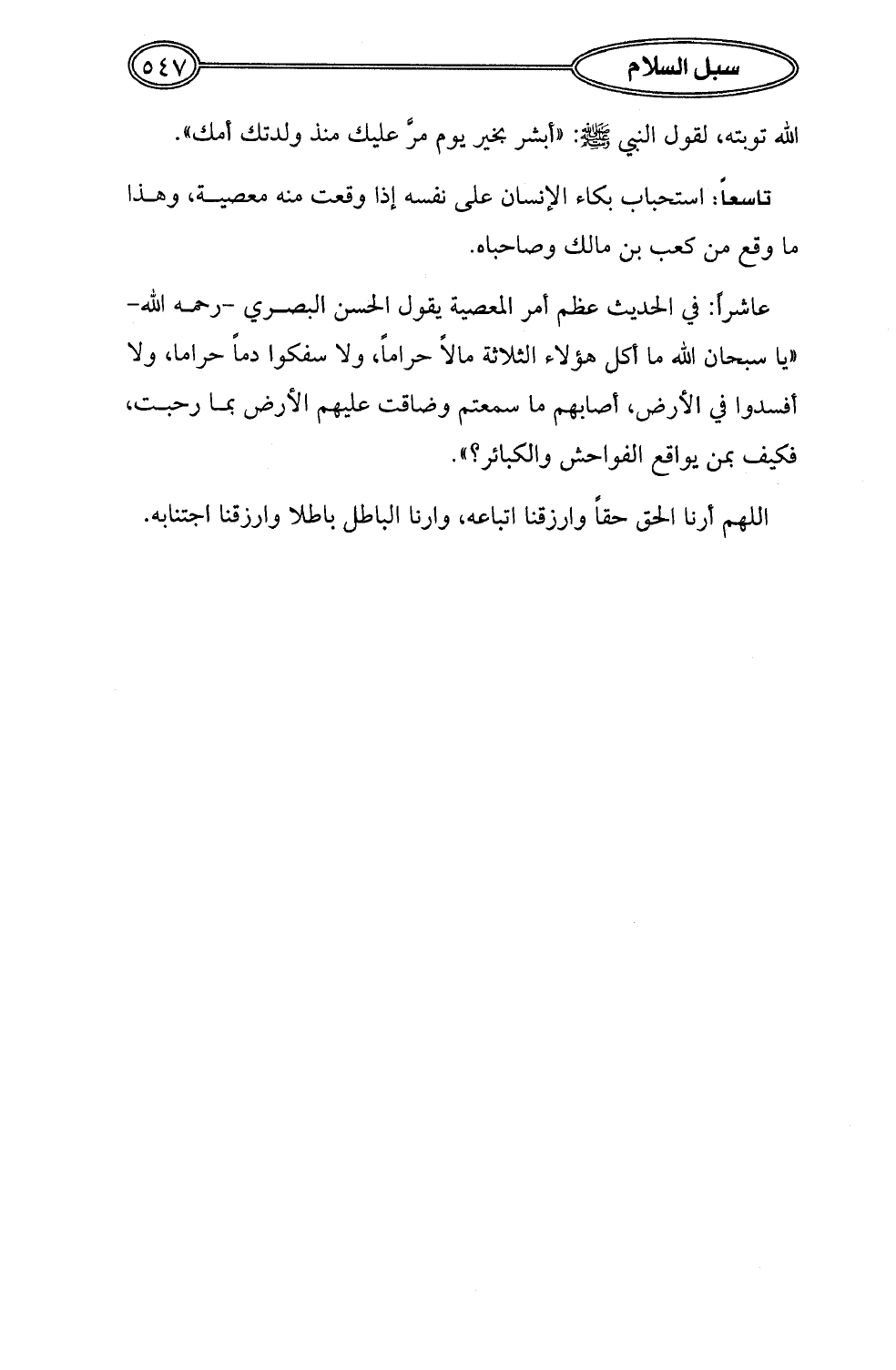 عاشراً: في الحديث عظم أمر المعصية يقول الحسن البصري -رحمه الله- "يا سبحان الله ما أكل هؤلاء الثلاثة مالاً حراماً، ولا سفكوا دماً حراماً، ولا أفسدوا في الأرض، أصابهم ما سمعتم وضاقت عليهم الأرض بما رحبت، فكيف بمن يواقع الفواحش والكبائر؟ ".