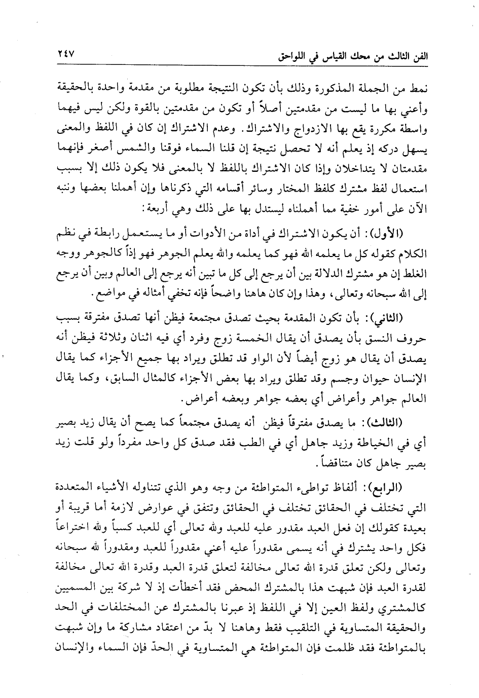 نمط من الجملة المذكورة، وذلك بأن تكون النتيجة مطلوبة من مقدمة واحدة بالحقيقة، وأعني بها ما ليست من مقدمتين أصلاً أو تكون من مقدمتين بالقوة ولكن ليس فيهما واسطة مكرّرة يقع بها الازدواج والاشتراك. وعدم الاشتراك إن كان في اللفظ والمعنى يسهل دركه، إذ يعلم أنه لا تحصل نتيجة إن قلنا السماء فوقنا والشمس أصغر فإنهما مقدمتان لا يتداخلان. وإذا كان الاشتراك باللفظ لا بالمعنى فلا يكون ذلك إلا بسبب استعمال لفظ مشترك كلفظ المختار وسائر أقسامه التي ذكرناها وان أهملنا بعضها وننبّه الآن على أمور خفية مما أهملناه ليستدل بها على ذلك وهي أربعة: الأول: أن يكون الاشتراك في أداة من الأدوات أو ما يستعمل رابطة في نظم الكلام، كقوله كل ما يعلمه الله فهو كما يعلمه والله يعلم الجوهر فهو إذاً كالجوهر، ووجه الغلط أن هو مشترك الدلالة بجن أن يرجع إلى كل ما تبتين أنه يرجع إلى العالم وبين أن يرجع إلى الله سبحانه وتعالى. وهذا وإن كان هاهنا واضحاً فإنه تخفى أمثاله في مواضع.