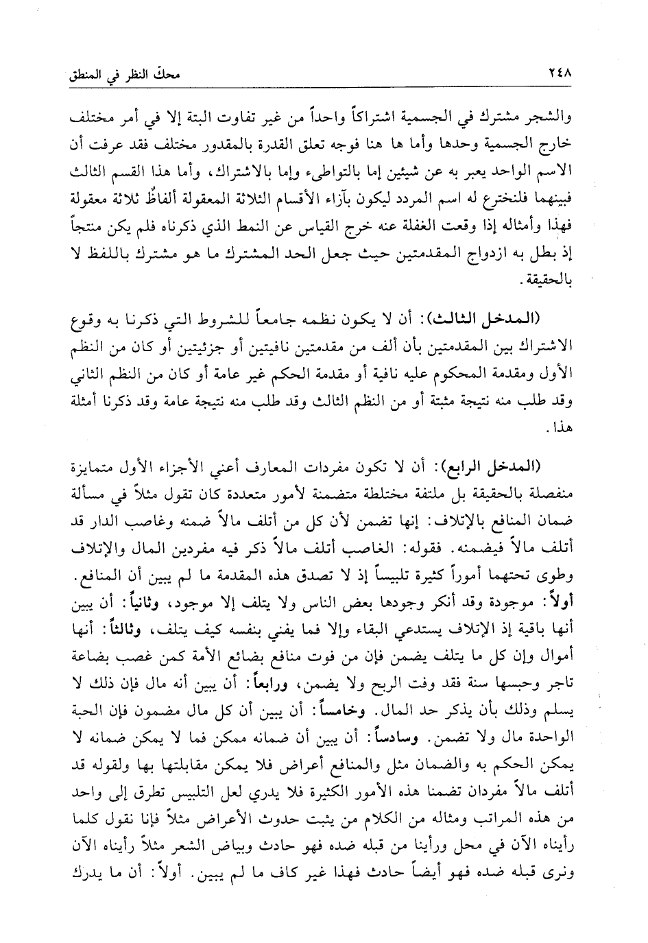 المدخل الثالث: أن لا يكون نظمه جامعاً للشروط التي ذكرنا بعد وقوع الاشتراك بين المقدمتين بأن ألّف من مقدمتين نافيتين أو جزئيتين، أو كان من النظم الأول ومقدمة المحكوم عليه نافية أو مقدمة الحكم غير عامة، أو كان من النظم الثاني وقد طلب منه نتيجة مثبتة، أو من النظم الثالث وقد طلب منه نتيجة عامة. وقد ذكرنا أمثلة هذا.