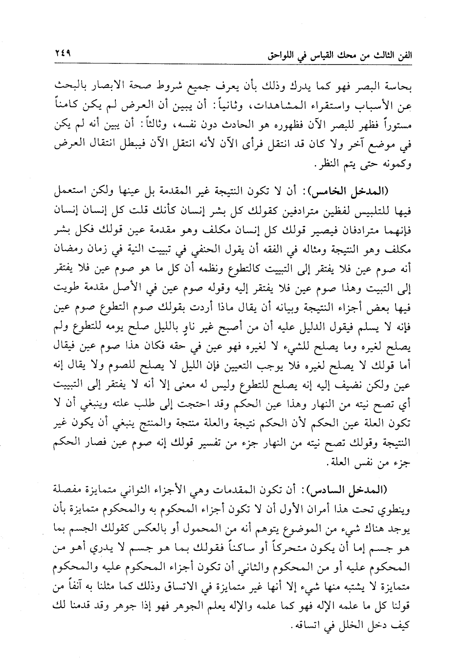 المدخل الخامس: أن لا تكون النتيجة غير المقدمة بل عينها ولكن استعمل فيها للتلبيس لفظين مترادفين، كقولك كل بشر إنسان كأنك قلت كل إنسان إنسان، فانهما مترادفان فيصير قولك كل إنسان مكلف وهو مقدمة عين قولك فكل بشر مكلف وهو النتيجة، ومثاله في الفقه أن يقول الحنفي في تبييت النية في زمان رمضان أنه صوم عين فلا يفتقر إلى التبييت كالتطوع، ونظمه أن كل ما هو صوم عين فلا يفتقر إلى التبييت وهذا صوم عين فلا يفتقر إليه. وقوله صوم عين في الأصل مقدمة طُويت فيها بعض أجزاء النتيجة. وبيانه أن يقال ماذا أردت بقولك صوم التطوع صوم عين، فانه لا يسلم فيقول الذليل عليه أن من أصبح غير ناوٍ بالليل صلح يومه للتطوع ولم يصلح لغيره وما يصلح للشيء لا لغيره فهو عين في حقه فكان هذا صوم عين فيقال: إما قولك لا يصلح لغيره فلا يوجب التعيين فإن الليل لا يصلح للصوم ولا يقال إنه عين ولكن نضيف إليه أنه يصلح للتطوع وليس له معنى إلا أنه لا يفتقر إلى التبييت، أي تصح نيته من النهار، وهذا عين الحكم وقد احتجت إلى طلب علته وينبغي أن لا تكون العلة عين الحكم لأن الحكم نتيجة والعلة منتجة والمنتج ينبغي أن يكون غير النتيجة. وقولك تصح نيته من النهار جزء من تفسير قولك أنه صوم عين فصار الحكم جزء من نفس العلة.