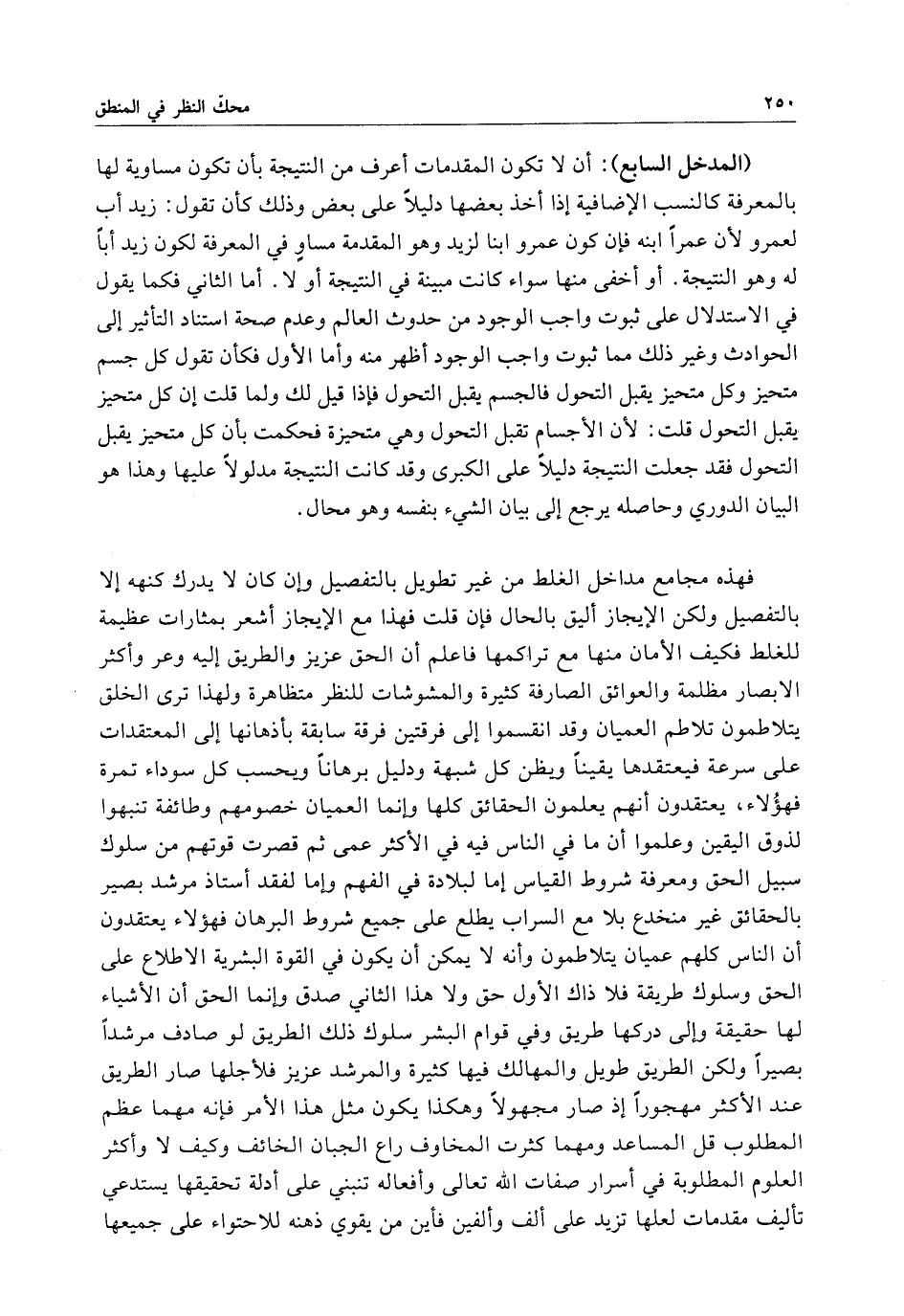 المدخل السابع: أن لا تكون المقدمات أعرف من النتيجة بان تكون مساوية لها بالمعرفة كالنسب الإضافية إذا اخذ بعضها دليلاً على بعض، وذلك كأن تقول زيد أب لعمرو لأن عمراً ابنه. فإن كون عمرو ابناً لزيد وهو المقدّمة مساو في المعرفة لكون زيد أباً له وهو النتيجة. أو أخفى منها سواء كانت مبيّنة في النتيجة أو لا. إما. الثاني فكما يقال في الاستدلال على ثبوت واجب الوجود من حدوث العالم وعدم صحة استناد التأثير إلى الحوادث، وغير ذلك مما ثبوت واجب الوجود أظهر منه. وأما الأول فكان تقول كل جسم متحيّز وكل متحيز يقبل التحول فالجسم يقبل التحوّل. فإذا قيل لك ولما قلت أن كل متحيز يقيل التحول قلت لأن الأجسام تقبل التحوّل وهي متحيزة فحكمت بأن كل متحيّز يقبل التحول، فقد جعلت النتيجة دليلاً على الكبرى وقد كانت النتيجة مدلولاً عليها. وهذا هو البيان الدوري وحاصله يرجع إلى بيان الشيء بنفسه وهو محال.