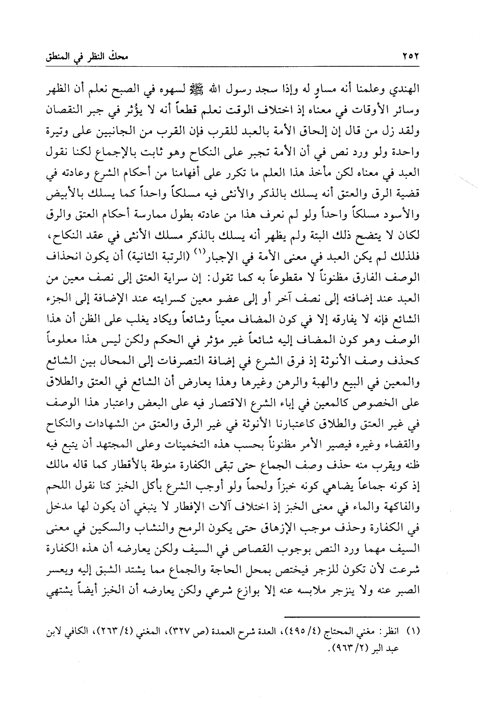 الهندي وعلمنا أنه مساوٍ له. وإذا سجد رسول الله لسهوه في الصبح نعلم أن الظهر وسائر الأوقات في معناه، إذ اختلاف الوقت نعلم قطعاَ أنه لا يؤثر في جبر النقصان. ولقد زلَ من قال إن إلحاق الأمة بالعبد للقرب، فإن القرب من الجانبين على وتيرة واحدة. ولو ورد نص في أن الأمة تجبر على النكاح وهو ثابت بالِإجماع لكنّا نقول العبد في معناه. ولكن مأخذ هذا العلم ما تكرّر على أفهامنا من أحكام الشرع وعادته في قضية الرق والعتق أنه يسلك بالذكر والأنثى فبه مسلكاَ واحداً كما يسلك بالأبيض والأسود مسلكاً واحداَ. ولو لم نعرف هذا من عادته بطول ممارسة أحكام العتق والرق لكان لا يتضح ذلك البتة ولم يظهر أنه يسلك بالذكر مسلك الأنثى في عقد النكاح، فلذلك لم يكن العبد في معنى الأمة في الإجبار. " الرتبة الثانية " أن يكون انحذاف الوصف الفارق مظنوناً لا مقطوعاً به كما تقول إن سراية العتق إلى نصف معين من العبد عند إضافته إلى نصف آخر أو إلى عضو معين كسرايته عند الِإضافة إلى الجزء الثائي، فإنه لا يفارقه إلا في كون المضاف معيّناً وشائعاً. ويكاد يغلب على الظن أن هذا الوصف وهو كون المضاف إليه شائعاَ غير مؤثّر في الحكم، ولكن ليس هذا معلوماً كحذف وصف الأنوثة، إذ فرق الشرع في إضافة التصرفات إلى المحال بين الشائع والمعين في البيع والهبة والرهن وغيرها، وهذا يعارض أن الشائع في العتق والطلاق على الخصوص كالمعيّن في إباء الشرع الاقتصار فيه على البعض واعتبار هذا الوصف كي غير العتق والطلاق، كاعتبارنا الأنوثة في غير الرق والعتقَ من الشهادات والنكاح والقضاء وغيره، فيصير الأمر مظنوناً بحسب هذه التخمينات، وعلى المجتهد أن يتبع فيه ظنه ويقرب منه حذف وصف الجماع حتى تبقى الكفارة منوطة بالإفطار كما قاله مالك. إذ كونه جماعاً يضاهي كونه خبزاَ ولحماً، ولو أوجب الشرع بأكل الخبز لكنا نقول اللحم والفاكهة والماء في معنى الخبز، إذ اختلاف آلات الإِفطار لا ينبغي أن يكون لها مدخل في الكفارة وحذف موجب الإزهاق، حتى يكون الرمح والنشاب والسكين في معنى السيف، مهما ورد النص بوجوب القصاص في السيف. ولكن يعارضه أن هذه الكفارة شرعت لأن تكون للزجر فيختص بمحل الحاجة والجماع مما يشتد الشبق إليه ويعسر الصبر عنه ولا ينزجر ملابسه عنه إلا بوازع شرعي، ولكن يعارضه أن الخز أيضاَ يشتهي