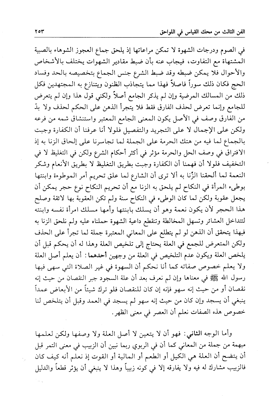 جماع العجوز الشوهاء بالصبية المشتهاة مع التفاوت، فيجاب عنه بأن ضبط مقادير الشهوات يختلف بالأشخاص والأحوال فلا يمكن ضبطه، وقد ضبط الشرع جنس الجماع بتخصيصه بالحد وفساد الحج، فكان ذلك سوراَ فاصلاَ. فهذا مما يتجاذب الظنون ويتنازع به المجتهدين، فكل ذلك من المسالك المرضية وان لم يذكر الجامع أصلا ولكني أقول هذا وان لم يتعرض للجامع، وإنما تعرض لحذف الفارق فقط. فلا يتجرأ الذهن على الحكم لحذف الفارق ولا بد من وصف في الأصل يكون المعنى الجامع المعتبر واستنشاق شمه من فرعه. ولكن على الإجمال لا على التجريد والتفصيلْ فلولا أنا عرفنا أن الكفارة وجبت بالجماع لما فيه من هتك الحرمة على الجملة لما تجاسرنا على إلحاق الزنا به، إذ الافتراق في وصف الحل والحرمة مؤثّر في أكثر أحكام الشرع، ولكن في التغليظ لا في التخفيف. فلولا أن فهمنا أن الكفارة وجبت بطريق التغليط. لا بطريق الإنعام وشكر النعمة لما ألحقنا الزنا به، ألا ترى أن الشارع لما علق تحريم أَمر الموطوءة وابنتها بوطئ المرأة في النكاح لم يلحق به الزنا، مع أن تحريم النكاح نوع حجر يمكن أن يجعل عقوبة، ولكن لما كان الوطىء في النكاح سنّة ولم تكن العقوبة بها لائقة وصلح هذا الحجر لأن يكون نعمة، وهو أن يسلك بابنتها وأمها مسلك امرأة نفسه وابنته لتتداخل العشائر وتسهل المخالطة وتنقطع داعية الشهوة حملناه عليه ولم نلحق الزنا به. فبهذا يتحقق أن الذهن لو لم يتطلع على المعاني المعتبرة جملة لما تجرّأ على الحذف، ولكن المتعرّض للجمع في العلة يحتاج إلى تلخيص العلة، وهذا له أن يحكم قبل أن يلخص العلة ويكون عدم التلخيص في العلة من وجهين: أحدهما أن يعلم أصل العلة ولا يعلم خصوص صفاته، كما إنا نحكم أن السهوة في غير الصلاة التي سهي فيها رسول الله في معناها، وإن لم نعرف بعد أن علة السجود جبر النقصان من حيث أنه نقصان أو من حيث أنه سهو فإنه إن كان للنقصان فلو ترك شيئاً من الأبعاض عمداً ينبغي أن يسجد، وإن كان من حيث أنه سهو لم يسجد في العمد وقبل أن يتلخص لنا خصوص هذه الصفات نعلم أن العصر في معنى الظهر. اع العجوز الشوهاء بالصبية المشتهاة مع التفاوت، فيجاب عنه بأن ضبط مقادير الشهوات يختلف بالأشخاص والأحوال فلا يمكن ضبطه، وقد ضبط الشرع جنس الجماع بتخصيصه بالحد وفساد الحج، فكان ذلك سوراَ فاصلاَ. فهذا مما يتجاذب الظنون ويتنازع به المجتهدين، فكل ذلك من المسالك المرضية وان لم يذكر الجامع أصلا ولكني أقول هذا وان لم يتعرض للجامع، وإنما تعرض لحذف الفارق فقط. فلا يتجرأ الذهن على الحكم لحذف الفارق ولا بد من وصف في الأصل يكون المعنى الجامع المعتبر واستنشاق شمه من فرعه. ولكن على الإجمال لا على التجريد والتفصيلْ فلولا أنا عرفنا أن الكفارة وجبت بالجماع لما فيه من هتك الحرمة على الجملة لما تجاسرنا على إلحاق الزنا به، إذ الافتراق في وصف الحل والحرمة مؤثّر في أكثر أحكام الشرع، ولكن في التغليظ لا في التخفيف. فلولا أن فهمنا أن الكفارة وجبت بطريق التغليط. لا بطريق الإنعام وشكر النعمة لما ألحقنا الزنا به، ألا ترى أن الشارع لما علق تحريم أَمر الموطوءة وابنتها بوطئ المرأة في النكاح لم يلحق به الزنا، مع أن تحريم النكاح نوع حجر يمكن أن يجعل عقوبة، ولكن لما كان الوطىء في النكاح سنّة ولم تكن العقوبة بها لائقة وصلح هذا الحجر لأن يكون نعمة، وهو أن يسلك بابنتها وأمها مسلك امرأة نفسه وابنته لتتداخل العشائر وتسهل المخالطة وتنقطع داعية الشهوة حملناه عليه ولم نلحق الزنا به. فبهذا يتحقق أن الذهن لو لم يتطلع على المعاني المعتبرة جملة لما تجرّأ على الحذف، ولكن المتعرّض للجمع في العلة يحتاج إلى تلخيص العلة، وهذا له أن يحكم قبل أن يلخص العلة ويكون عدم التلخيص في العلة من وجهين: أحدهما أن يعلم أصل العلة ولا يعلم خصوص صفاته، كما إنا نحكم أن السهوة في غير الصلاة التي سهي فيها رسول الله في معناها، وإن لم نعرف بعد أن علة السجود جبر النقصان من حيث أنه نقصان أو من حيث أنه سهو فإنه إن كان للنقصان فلو ترك شيئاً من