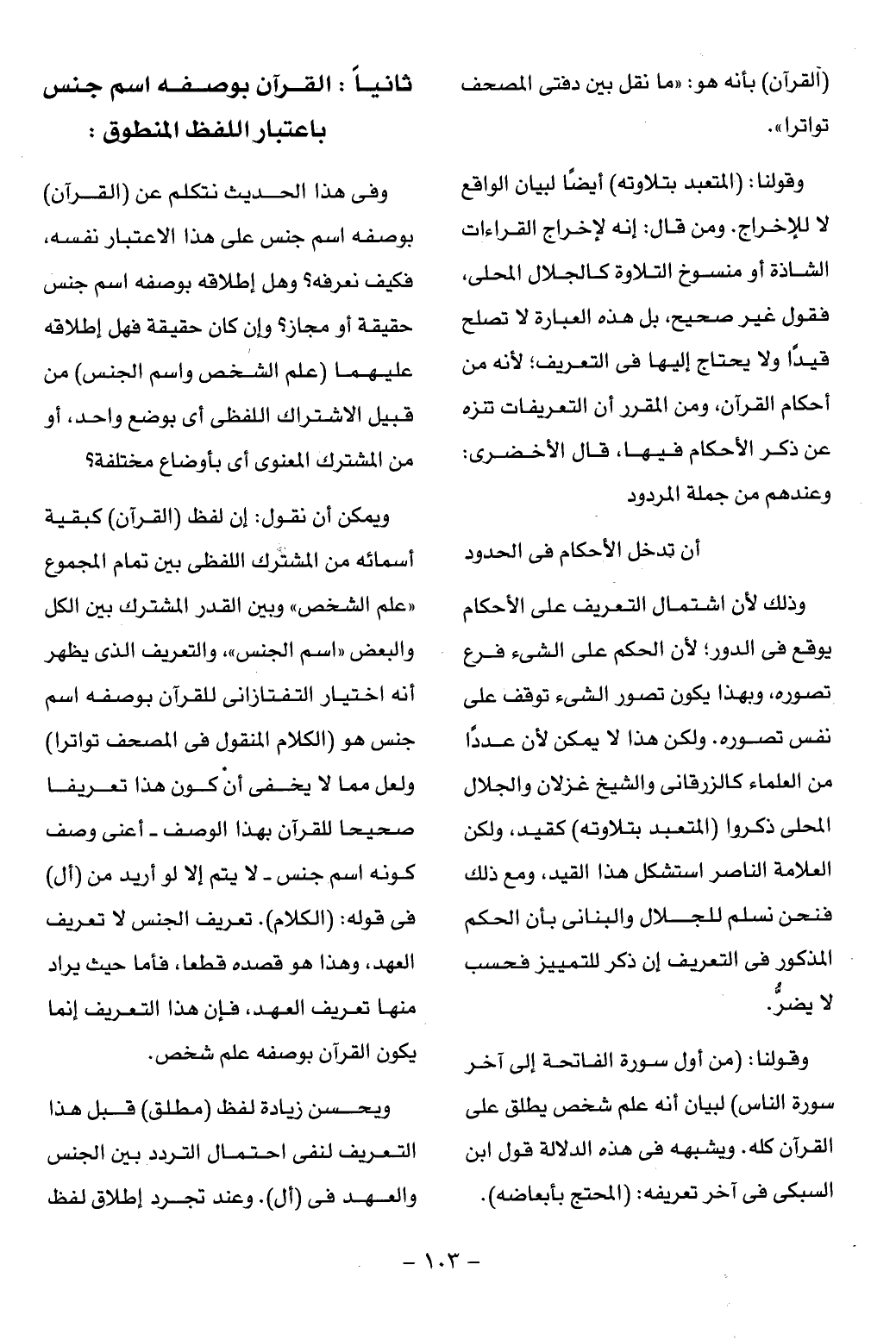 ويمكن أن نقول: إن لفظ (القرآن) كبقية أسمائه من المشترك اللفظى بين تمام المجموع «علم الشخص» وبين القدر المشترك بين الكل والبعض «اسم الجنس»، والتعريف الذى يظهر أنه اختيار التفتازانى للقرآن بوصفه اسم جنس هو (الكلام المنقول فى المصحف تواترا) ولعل مما لا يخفى أن كون هذا تعريفا صحيحا للقرآن بهذا الوصف- أعنى وصف كونه اسم جنس- لا يتم إلا لو أريد من (أل) فى قوله: (الكلام). تعريف الجنس لا تعريف العهد، وهذا هو قصده قطعا، فأما حيث يراد منها تعريف العهد، فإن هذا التعريف إنما يكون القرآن بوصفه علم شخص.