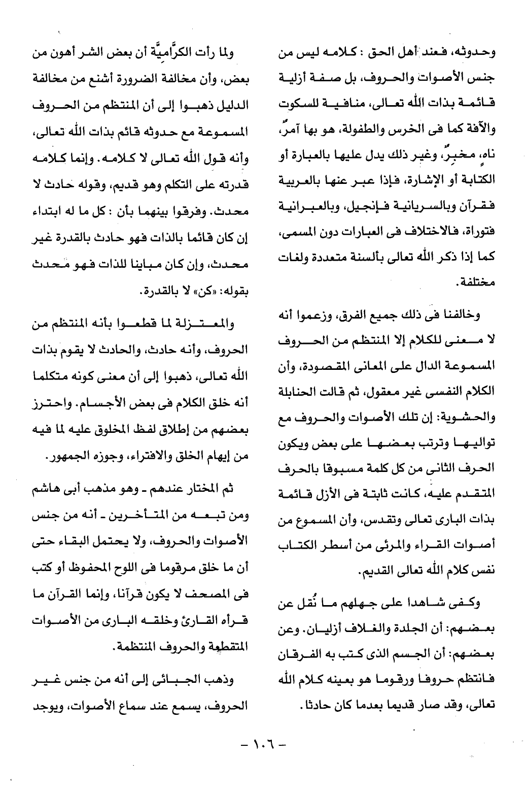 وخالفنا فى ذلك جميع الفرق، وزعموا أنه لا معنى للكلام إلا المنتظم من الحروف المسموعة الدال على المعانى المقصودة، وأن الكلام النفسى غير معقول، ثم قالت الحنابلة والحشوية: إن تلك الأصوات والحروف مع تواليها وترتب بعضها على بعض ويكون الحرف الثانى من كل كلمة مسبوقا بالحرف المتقدم عليه، كانت ثابتة فى الأزل قائمة بذات البارى تعالى وتقدس، وأن المسموع من أصوات القراء والمرئى من أسطر الكتاب نفس كلام الله تعالى القديم.