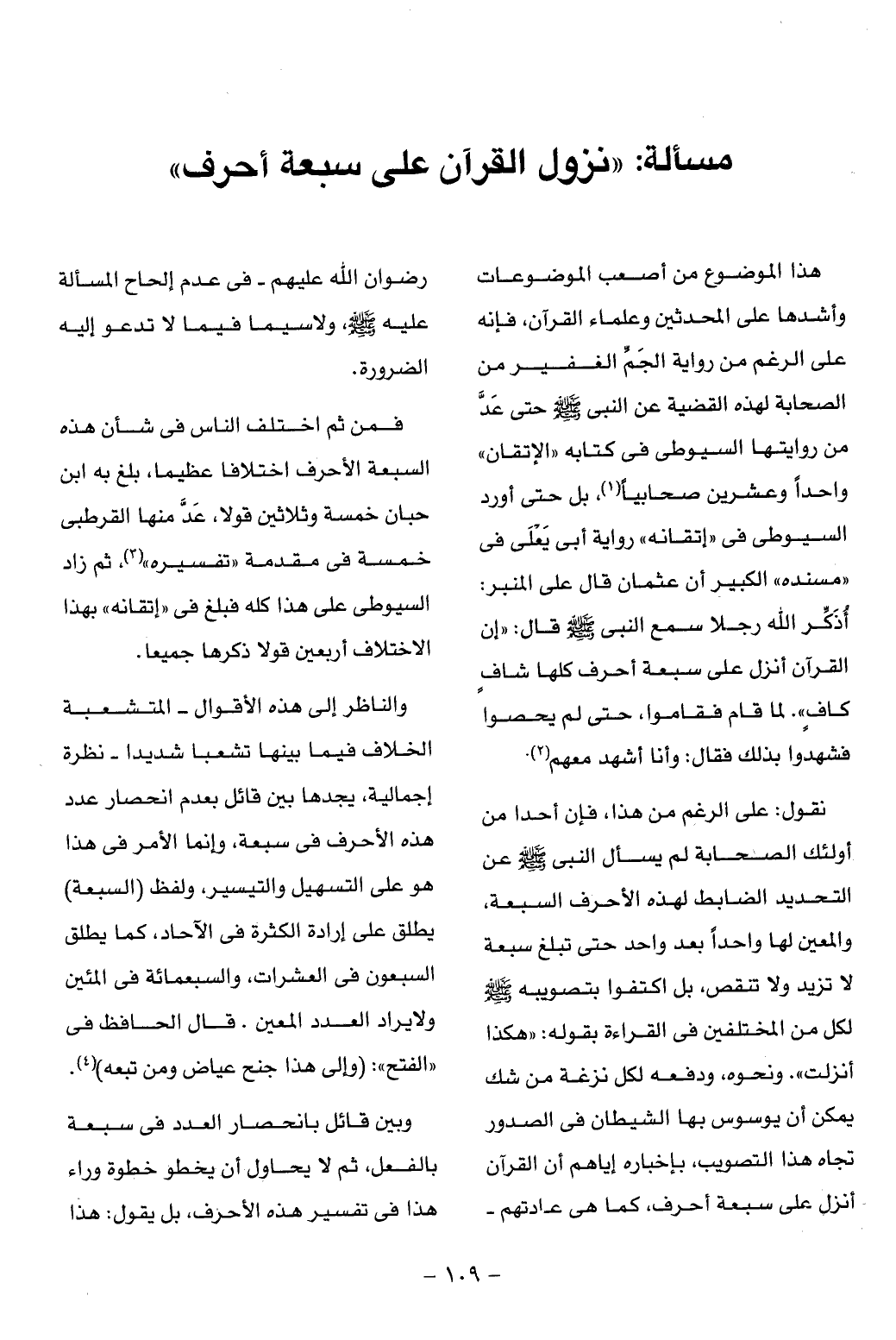 نقول: على الرغم من هذا، فإن أحدا من أولئك الصحابة لم يسأل النبى صلّى الله عليه وسلم عن التحديد الضابط لهذه الأحرف السبعة، والمعين لها واحدا بعد واحد حتى تبلغ سبعة لا تزيد ولا تنقص، بل اكتفوا بتصويبه صلّى الله عليه وسلم لكل من المختلفين فى القراءة بقوله: «هكذا أنزلت». ونحوه، ودفعه لكل نزغة من شك يمكن أن يوسوس بها الشيطان فى الصدور تجاه هذا التصويب، بإخباره إياهم أن القرآن أنزل على سبعة أحرف، كما هى عادتهم- رضوان الله عليهم- فى عدم إلحاح المسألة عليه صلّى الله عليه وسلم، ولا سيما فيما لا تدعو إليه الضرورة.