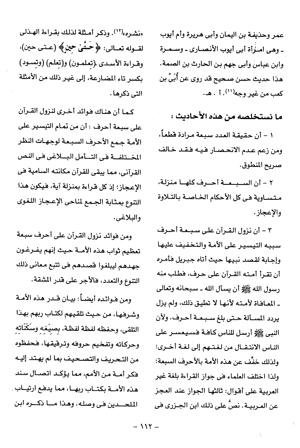 2 - أن السبعة أحرف كلها منزلة، متساوية فى كل الأحكام الخاصة بالتلاوة والإعجاز.
