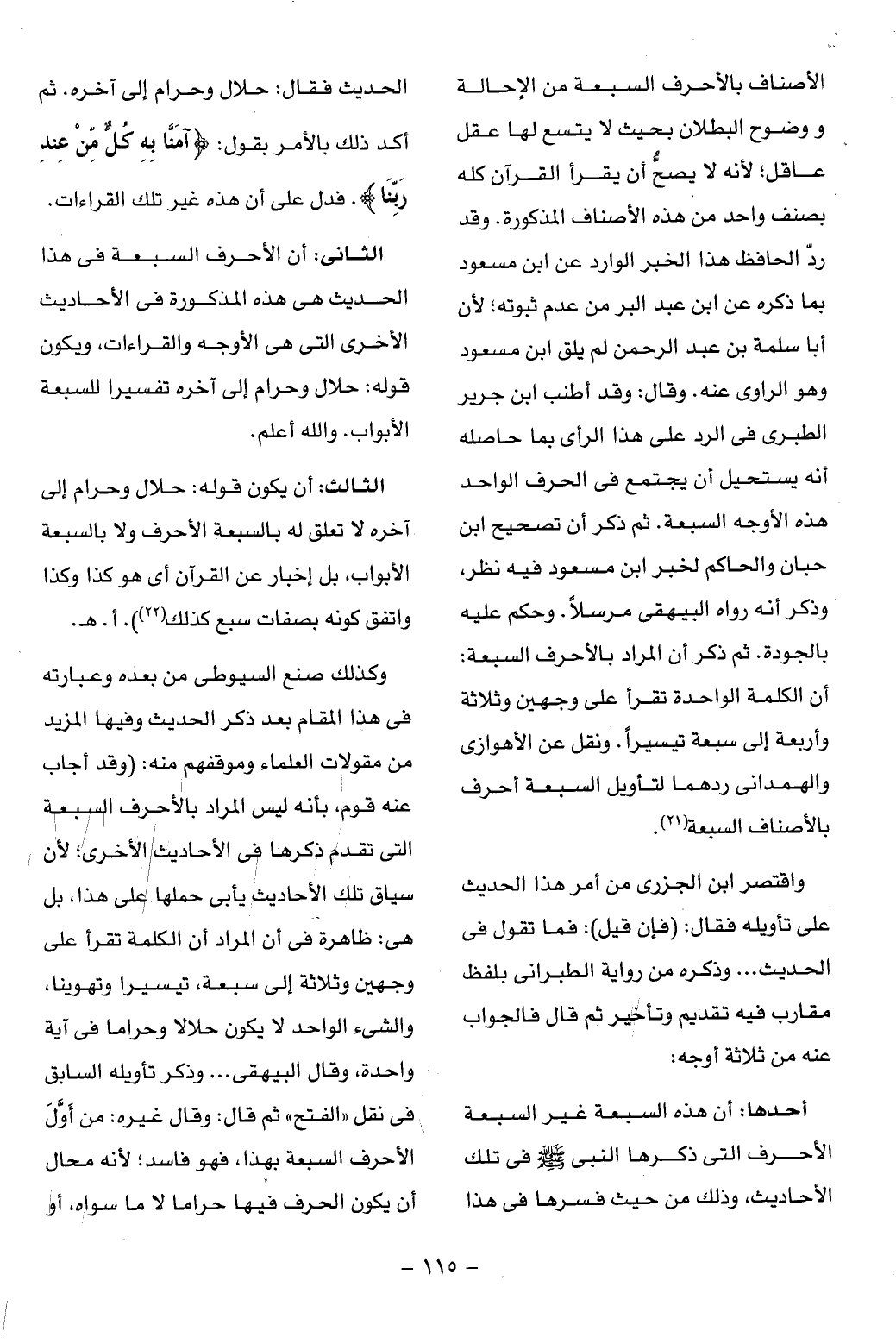الثانى: أن الأحرف السبعة فى هذا الحديث هى هذه المذكورة فى الأحاديث الأخرى التى هى الأوجه والقراءات، ويكون قوله: حلال وحرام إلى آخره تفسيرا للسبعة الأبواب. والله أعلم.