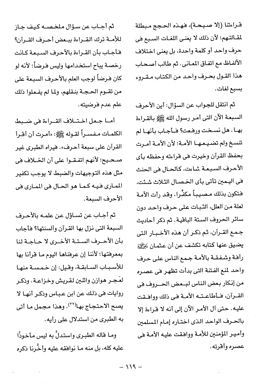 مكفّرا، وقد رأت الأمة لعلة من العلل، الثبات على حرف واحد دون سائر الحروف الستة الباقية. ثم ذكر أحاديث جمع القرآن، ثم ذكر أن هذه الأخبار التى يضيق عنها كتابه تكشف عن أن عثمان رضي الله عنه رأفة وشفقة بالأمة جمع الناس على حرف واحد لمنع الفتنة التى بدأت تظهر فى عصره من إنكار بعض الناس لبعض الحروف فى القرآن، فأطاعته الأمة فى ذلك ووافقت عليه. حتى آل الأمر الآن إلى أنه لا قراءة إلا بالحرف الواحد الذى اختاره إمام المسلمين وأمير المؤمنين للأمة ووافقت عليه الأمة فى عصره وأقرته.