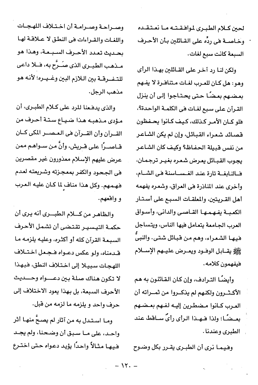 لحين كلام الطبرى لموافقته ما نعتقده وخاصة فى ردّه على القائلين بأن الأحرف السبعة كانت سبع لغات.