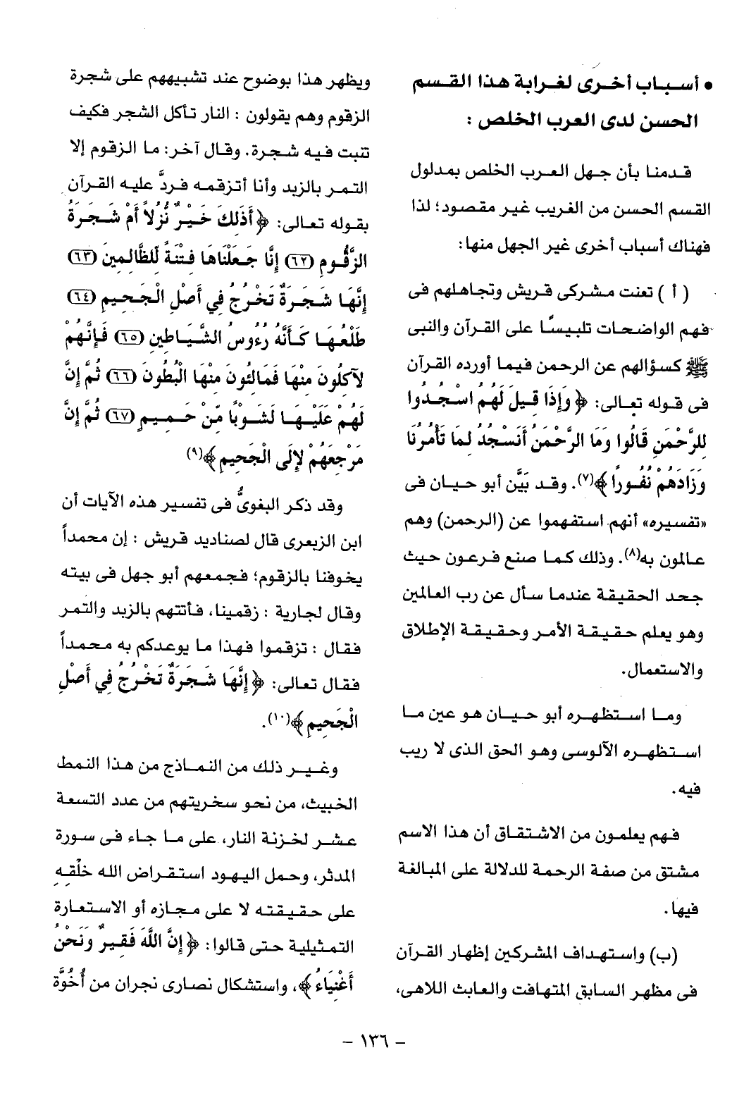 (ب) واستهداف المشركين إظهار القرآن فى مظهر السابق المتهافت والعابث اللاهى، ويظهر هذا بوضوح عند تشبيههم على شجرة الزقوم وهم يقولون: النار تأكل الشجر فكيف تنبت فيه شجرة. وقال آخر: ما الزقوم إلا التمر بالزبد وأنا أتزقمه فردّ عليه القرآن بقوله تعالى: أَذلِكَ خَيْرٌ نُزُلًا أَمْ شَجَرَةُ الزَّقُّومِ (62) إِنَّا جَعَلْناها فِتْنَةً لِلظَّالِمِينَ (63) إِنَّها شَجَرَةٌ تَخْرُجُ فِي أَصْلِ الْجَحِيمِ (64) طَلْعُها كَأَنَّهُ رُؤُسُ الشَّياطِينِ (65) فَإِنَّهُمْ لَآكِلُونَ مِنْها فَمالِؤُنَ مِنْهَا الْبُطُونَ (66) ثُمَّ إِنَّ لَهُمْ عَلَيْها لَشَوْباً مِنْ حَمِيمٍ (67) ثُمَّ إِنَّ مَرْجِعَهُمْ لَإِلَى الْجَحِيمِ (¬9)