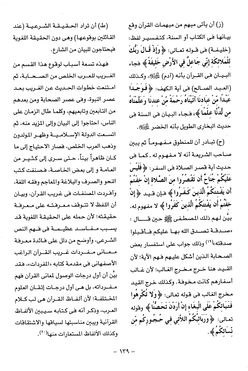 فهذه تسعة أسباب لوقوع هذا القسم من الغريب للعرب الخلص من الصحابة، ثم امتنعت خطوات الحديث عن الغريب بعد عصر النبوة، وفى عصر الصحابة ومن بعدهم من التابعين وتابعيهم، وكلما طال الزمان على الناس، احتاجوا إلى البيان وإلى المزيد منه، ثم اتسعت الدولة الإسلامية وظهر المولدون وذهب العرب الخلص، فصار الاحتياج إلى ما كان ظاهرا بينا، حتى سرى إلى كثير من العامة وإلى بعض الخاصة، فصنفت كتب النحو والصرف والبلاغة والمعاجم وفقه اللغة، وأفردت المصنفات فى غريب القرآن، وبيان أن اللفظ لا تتوقف معرفته على معرفة حقيقته؛ لأن حمله على الحقيقة اللغوية قد يسبب مفاسد عظيمة فى فهم النص الشرعى، وأوضح من دلل على فائدة معرفة معانى مفردات غريب القرآن الراغب الأصفهانى فى مقدمة كتابه «المفردات»، فقد بيّن أن أول درجات الوصول لمعانى القرآن فهم مفرداته، بل هى أول درجات إتقان العلوم المختلفة؛ لأن ألفاظ القرآن هى لب كلام العرب، وذكر أنه فى كتابه سيبين الألفاظ القرآنية ويبين مناسبتها لسياقها والاشتقاقات وكذلك الألفاظ المستعارات منها (¬20).