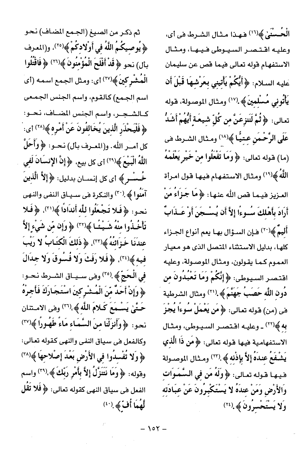 الْحُسْنى (¬16) فهذا مثال الشرط فى أى، وعليه اقتصر السيوطى فيها، ومثال الاستفهام قوله تعالى فيما قص عن سليمان عليه السلام: أَيُّكُمْ يَأْتِينِي بِعَرْشِها قَبْلَ أَنْ يَأْتُونِي مُسْلِمِينَ. (¬17) ومثال الموصولة، قوله تعالى: ثُمَّ لَنَنْزِعَنَّ مِنْ كُلِّ شِيعَةٍ أَيُّهُمْ أَشَدُّ عَلَى الرَّحْمنِ عِتِيًّا (¬18) ومثال الشرط فى (ما) قوله تعالى: وَما تَفْعَلُوا مِنْ خَيْرٍ يَعْلَمْهُ اللَّهُ (¬19) ومثال الاستفهام فيها قول امرأة العزيز فيما قص الله عنها: ما جَزاءُ مَنْ أَرادَ بِأَهْلِكَ سُوءاً إِلَّا أَنْ يُسْجَنَ أَوْ عَذابٌ أَلِيمٌ (¬20) فإن السؤال بها يعم أنواع الجزاء كلها، بدليل الاستثناء المتصل الذى هو معيار العموم كما يقولون، ومثال الموصولة، وعليه اقتصر السيوطى: إِنَّكُمْ وَما تَعْبُدُونَ مِنْ دُونِ اللَّهِ حَصَبُ جَهَنَّمَ. (¬21) ومثال الشرطية فى (من) قوله تعالى: مَنْ يَعْمَلْ سُوءاً يُجْزَ بِهِ (¬22) - وعليه اقتصر السيوطى، ومثال الاستفهامية فيها قوله تعالى: مَنْ ذَا الَّذِي يَشْفَعُ عِنْدَهُ إِلَّا بِإِذْنِهِ. (¬23) ومثال الموصولة فيها قوله تعالى: وَلَهُ مَنْ فِي السَّماواتِ وَالْأَرْضِ وَمَنْ عِنْدَهُ لا يَسْتَكْبِرُونَ عَنْ عِبادَتِهِ وَلا يَسْتَحْسِرُونَ. (¬24)