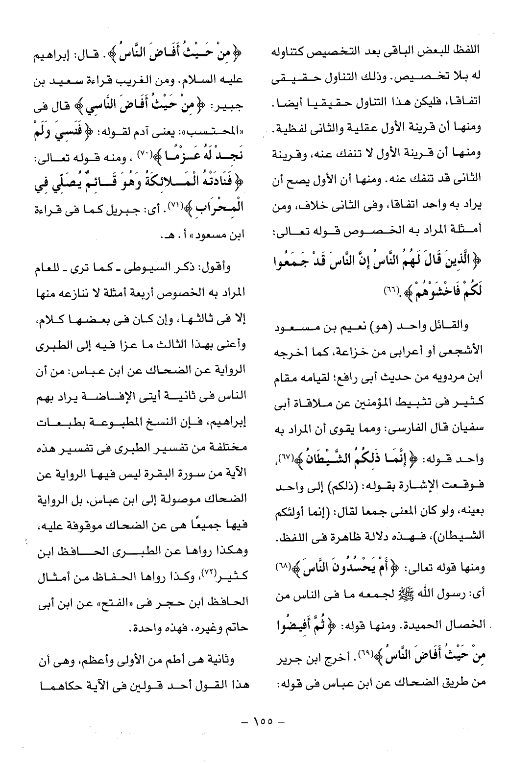 وأقول: ذكر السيوطى- كما ترى- للعام المراد به الخصوص أربعة أمثلة لا ننازعه منها إلا فى ثالثها، وإن كان فى بعضها كلام، وأعنى بهذا الثالث ما عزا فيه إلى الطبرى الرواية عن الضحاك عن ابن عباس: من أن الناس فى ثانية آيتى الإفاضة يراد بهم إبراهيم، فإن النسخ المطبوعة بطبعات مختلفة من تفسير الطبرى فى تفسير هذه الآية من سورة البقرة ليس فيها الرواية عن الضحاك موصولة إلى ابن عباس، بل الرواية فيها جميعا هى عن الضحاك موقوفة عليه، وهكذا رواها عن الطبرى الحافظ ابن كثير (¬72)، وكذا رواها الحفاظ من أمثال الحافظ ابن حجر فى «الفتح» عن ابن أبى حاتم وغيره. فهذه واحدة.