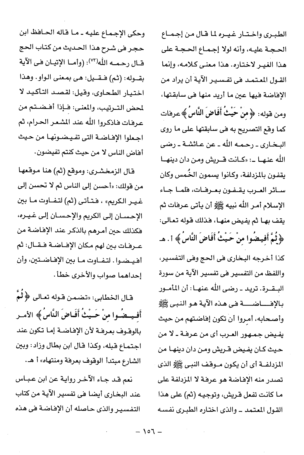 ثُمَّ أَفِيضُوا مِنْ حَيْثُ أَفاضَ النَّاسُ أ. هـ كذا أخرجه البخارى فى الحج وفى التفسير، واللفظ من التفسير فى تفسير الآية من سورة البقرة. تريد- رضى الله عنها: أن المأمور بالإفاضة فى هذه الآية هو النبى صلّى الله عليه وسلم وأصحابه، أمروا أن تكون إفاضتهم من حيث يفيض جمهور العرب أى من عرفة- لا من حيث كان يفيض قريش ومن دان دينها من المزدلفة أى أن يكون موقف النبى صلّى الله عليه وسلم الذى تصدر منه الإفاضة هو عرفة لا المزدلفة على ما كانت تفعل قريش، وتوجيه (ثم) على هذا القول المعتمد- والذى اختاره الطبرى نفسه وحكى الإجماع عليه- ما قاله الحافظ ابن حجر فى شرح هذا الحديث من كتاب الحج قال رحمه الله (¬73): (وأما الإتيان فى الآية بقوله: (ثم) فقيل: هى بمعنى الواو. وهذا اختيار الطحاوى، وقيل: لقصد التأكيد لا لمحض الترتيب، والمعنى: فإذا أفضتم من عرفات فاذكروا الله عند المشعر الحرام، ثم اجعلوا الإفاضة التى تفيضونها من حيث أفاض الناس لا من حيث كنتم تفيضون.