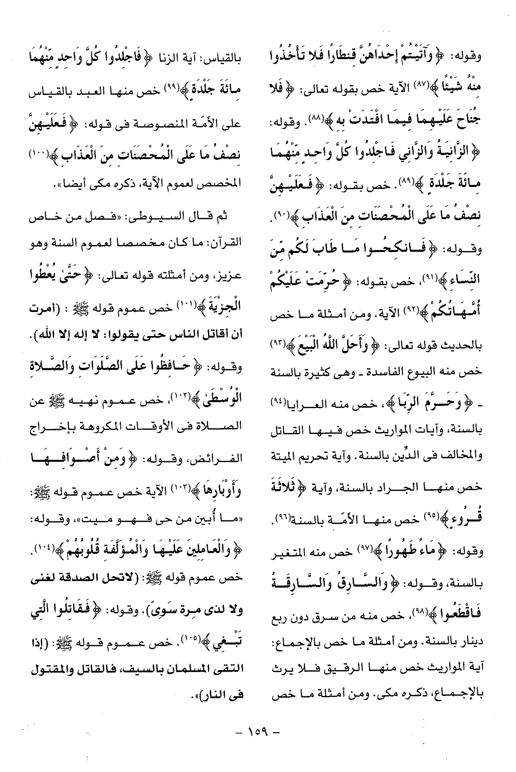 ثم قال السيوطى: «فصل من خاص القرآن: ما كان مخصصا لعموم السنة وهو عزيز، ومن أمثلته قوله تعالى: حَتَّى يُعْطُوا الْجِزْيَةَ (¬101) خص عموم قوله صلّى الله عليه وسلم: (أمرت أن أقاتل الناس حتى يقولوا: لا إله إلا الله).