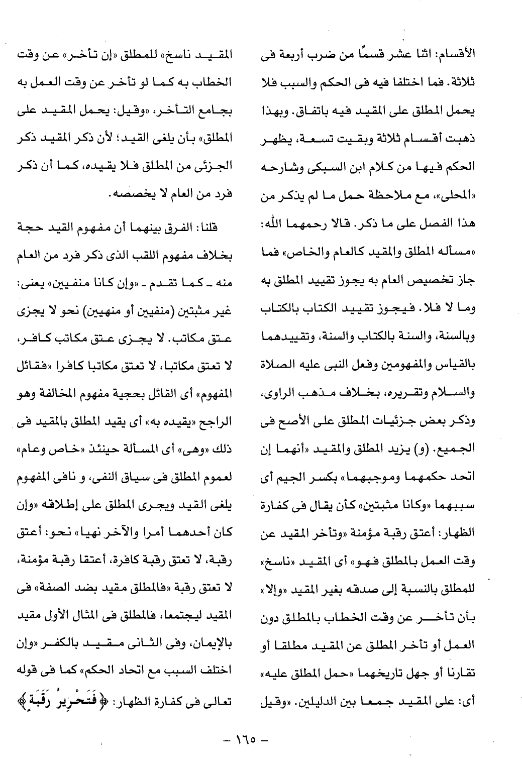 الأقسام: اثنا عشر قسما من ضرب أربعة فى ثلاثة. فما اختلفا فيه فى الحكم والسبب فلا يحمل المطلق على المقيد فيه باتفاق. وبهذا ذهبت أقسام ثلاثة وبقيت تسعة، يظهر الحكم فيها من كلام ابن السبكى وشارحه «المحلى»، مع ملاحظة حمل ما لم يذكر من هذا الفصل على ما ذكر. قالا رحمهما الله: