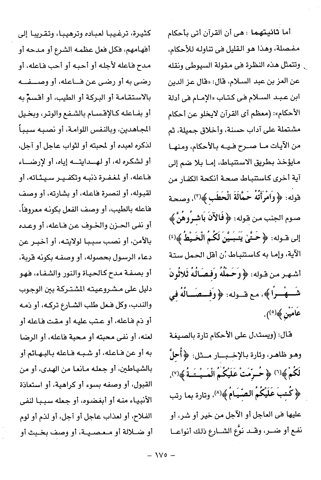 أما ثانيتهما: هى أن القرآن أتى بأحكام مفصلة، وهذا هو القليل فى تناوله للأحكام، وتتمثل هذه النظرة فى مقولة السيوطى ونقله عن العز بن عبد السلام، قال: «قال عز الدين ابن عبد السلام فى كتاب «الإمام فى أدلة الأحكام»: (معظم آى القرآن لا يخلو عن أحكام مشتملة على آداب حسنة، وأخلاق جميلة، ثم من الآيات ما صرح فيه بالأحكام، ومنها ما يؤخذ بطريق الاستنباط، إما بلا ضم إلى آية أخرى كاستنباط صحة أنكحة الكفار من قوله: وَامْرَأَتُهُ حَمَّالَةَ الْحَطَبِ (¬3)، وصحة صوم الجنب من قوله: فَالْآنَ بَاشِرُوهُنَّ إلى قوله: حَتَّى يَتَبَيَّنَ لَكُمُ الْخَيْطُ (¬4) الآية، وإما به كاستنباط أن أقل الحمل ستة أشهر من قوله: وَحَمْلُهُ وَفِصالُهُ ثَلاثُونَ شَهْراً، مع قوله: وَفِصالُهُ فِي عامَيْنِ (¬5)).