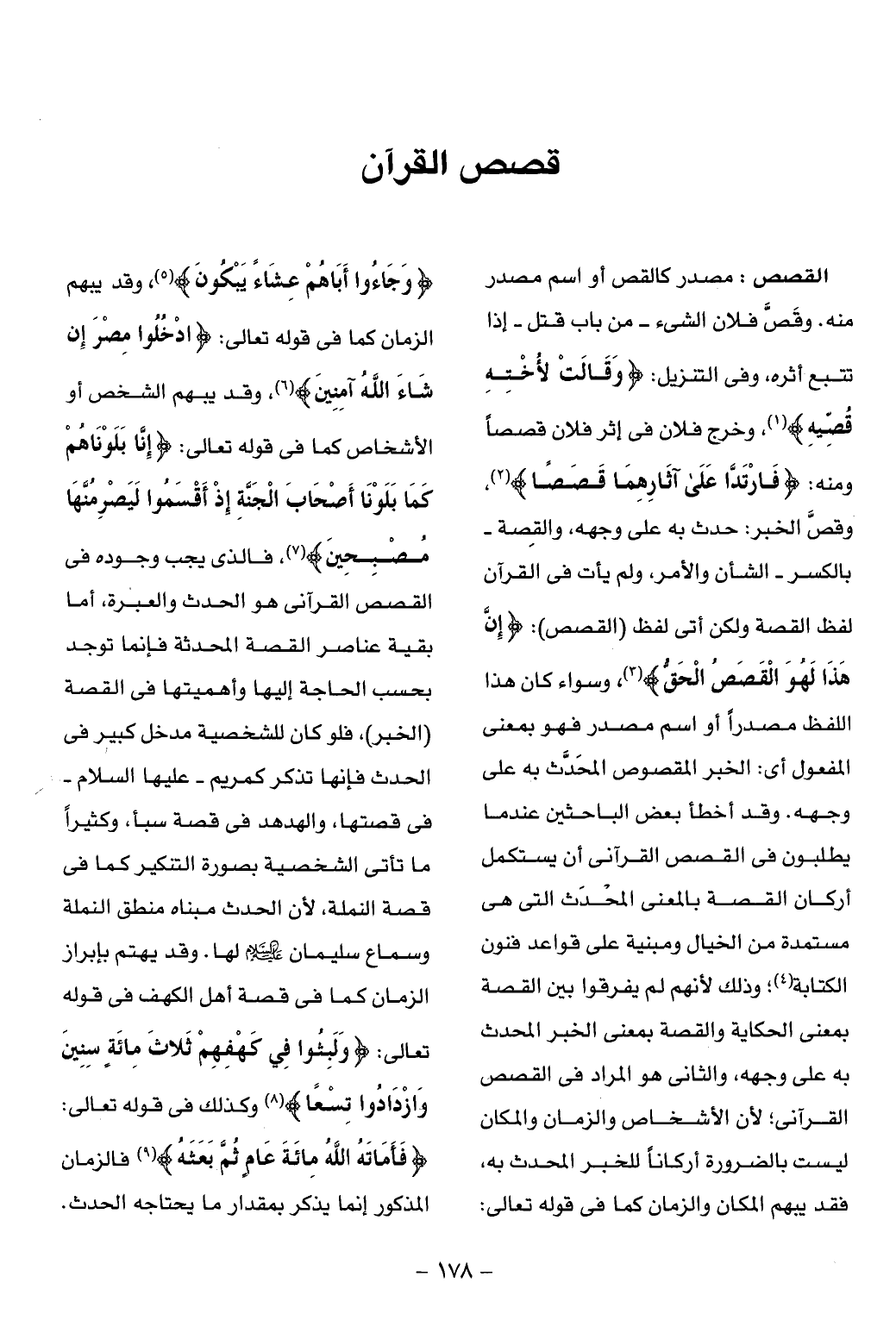 (¬2)، وقصّ الخبر: حدث به على وجهه، والقصة- بالكسر- الشأن والأمر، ولم يأت فى القرآن لفظ القصة ولكن أتى لفظ (القصص): إِنَّ هذا لَهُوَ الْقَصَصُ الْحَقُّ (¬3)، وسواء كان هذا اللفظ مصدرا أو اسم مصدر فهو بمعنى المفعول أى: الخبر المقصوص المحدّث به على وجهه. وقد أخطأ بعض الباحثين عند ما يطلبون فى القصص القرآنى أن يستكمل أركان القصة بالمعنى المحدث التى هى مستمدة من الخيال ومبنية على قواعد فنون الكتابة (¬4)؛ وذلك لأنهم لم يفرقوا بين القصة بمعنى الحكاية والقصة بمعنى الخبر المحدث به على وجهه، والثانى هو المراد فى القصص القرآنى؛ لأن الأشخاص والزمان والمكان ليست بالضرورة أركانا للخبر المحدث به، فقد يبهم المكان والزمان كما فى قوله تعالى: