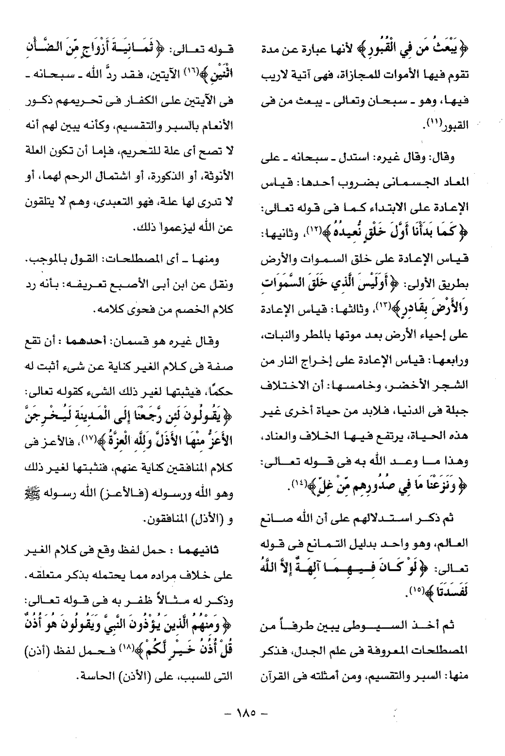 ثم أخذ السيوطى يبين طرفا من المصطلحات المعروفة فى علم الجدل، فذكر منها: السبر والتقسيم، ومن أمثلته فى القرآن قوله تعالى: ثَمانِيَةَ أَزْواجٍ مِنَ الضَّأْنِ اثْنَيْنِ (¬16) الآيتين، فقد ردّ الله- سبحانه- فى الآيتين على الكفار فى تحريمهم ذكور الأنعام بالسبر والتقسيم، وكأنه يبين لهم أنه لا تصح أى علة للتحريم، فإما أن تكون العلة الأنوثة، أو الذكورة، أو اشتمال الرحم لهما، أو لا تدرى لها علة، فهو التعبدى، وهم لا يتلقون عن الله ليزعموا ذلك.