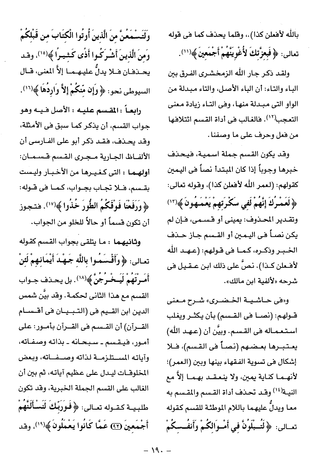 و «فى حاشية الخضرى» شرح معنى قولهم: (نصا فى القسم) بأن يكثر ويغلب استعماله فى القسم. وبيّن أن (عهد الله) يعتبرها بعضهم (نصا فى القسم)، فلا إشكال فى تسوية الفقهاء بينها وبين (العمر)؛ لأنهما كناية يمين، ولا ينعقد بهما إلّا مع النية (¬14) وقد تحذف أداة القسم والمقسم به معا ويدلّ عليهما باللام الموطئة للقسم كقوله تعالى: لَتُبْلَوُنَّ فِي أَمْوالِكُمْ وَأَنْفُسِكُمْ وَلَتَسْمَعُنَّ مِنَ الَّذِينَ أُوتُوا الْكِتابَ مِنْ قَبْلِكُمْ وَمِنَ الَّذِينَ أَشْرَكُوا أَذىً كَثِيراً (¬15)، وقد يحذفان فلا يدلّ عليهما إلّا المعنى، قال السيوطى نحو: وَإِنْ مِنْكُمْ إِلَّا وارِدُها (¬16).