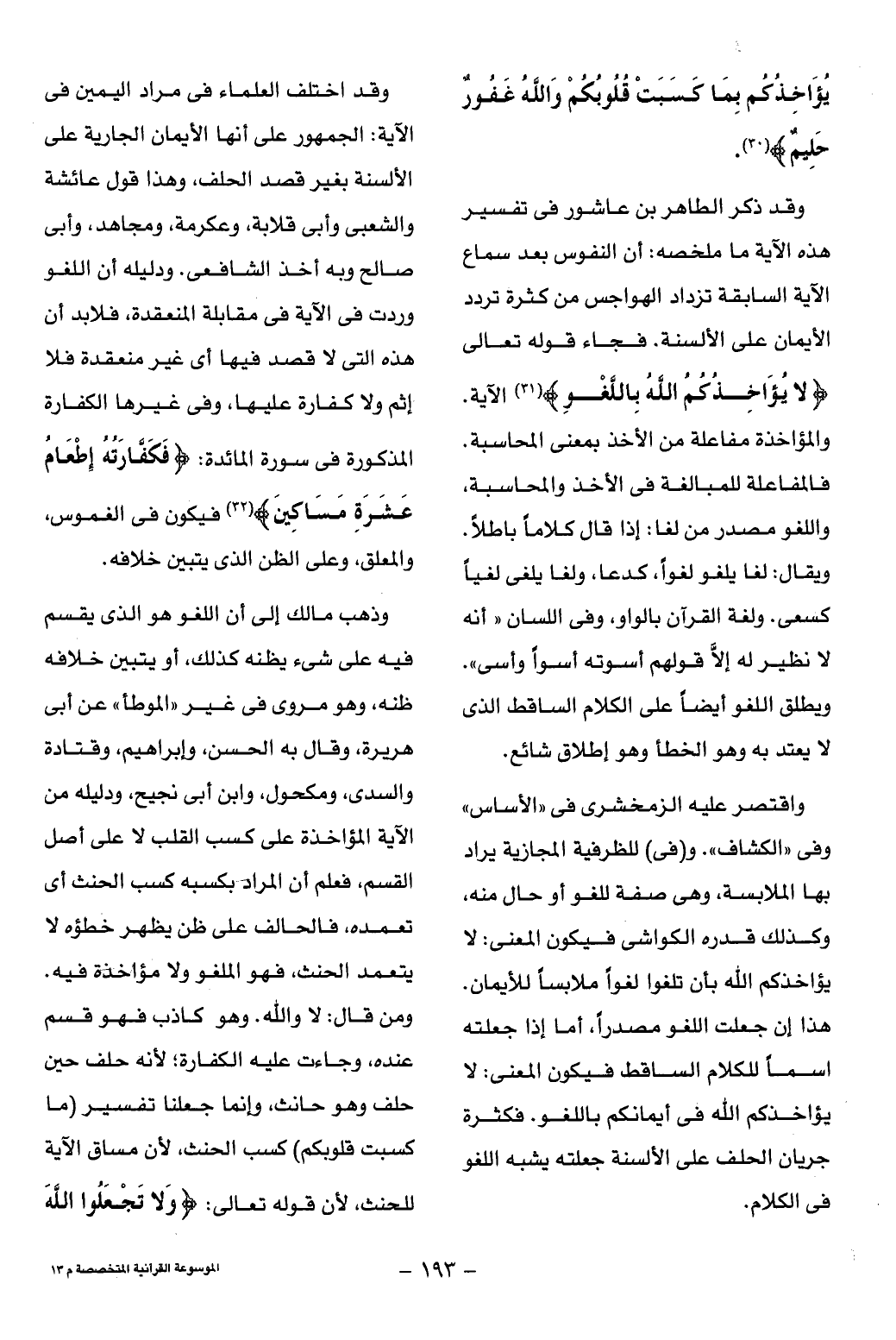 وقد اختلف العلماء فى مراد اليمين فى الآية: الجمهور على أنها الأيمان الجارية على الألسنة بغير قصد الحلف، وهذا قول عائشة والشعبى وأبى قلابة، وعكرمة، ومجاهد، وأبى صالح وبه أخذ الشافعى. ودليله أن اللغو وردت فى الآية فى مقابلة المنعقدة، فلا بد أن هذه التى لا قصد فيها أى غير منعقدة فلا إثم ولا كفارة عليها، وفى غيرها الكفارة المذكورة فى سورة المائدة: فَكَفَّارَتُهُ إِطْعامُ عَشَرَةِ مَساكِينَ (¬32) فيكون فى الغموس، والمعلق، وعلى الظن الذى يتبين خلافه.