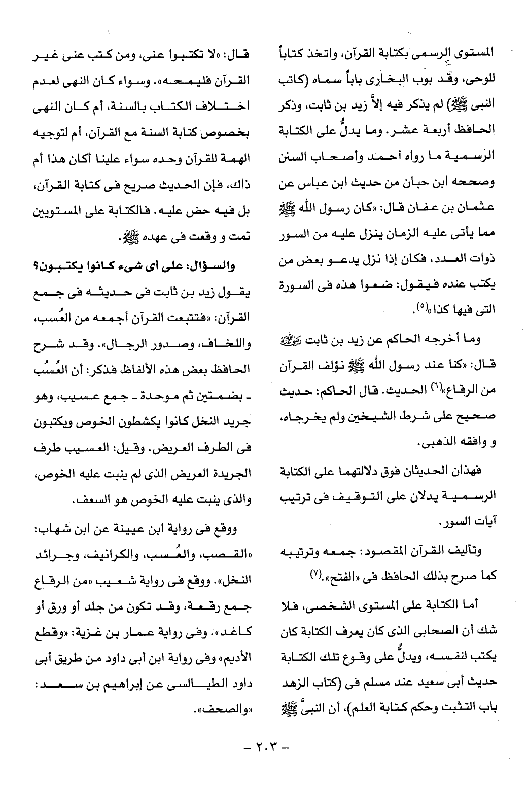 المستوى الرسمى بكتابة القرآن، واتخذ كتابا للوحى، وقد بوب البخارى بابا سماه (كاتب النبى صلّى الله عليه وسلم) لم يذكر فيه إلّا زيد بن ثابت، وذكر الحافظ أربعة عشر. وما يدلّ على الكتابة الرسمية ما رواه أحمد وأصحاب السنن وصححه ابن حبان من حديث ابن عباس عن عثمان بن عفان قال: «كان رسول الله صلّى الله عليه وسلم مما يأتى عليه الزمان ينزل عليه من السور ذوات العدد، فكان إذا نزل يدعو بعض من يكتب عنده فيقول: ضعوا هذه فى السورة التى فيها كذا» (¬5).