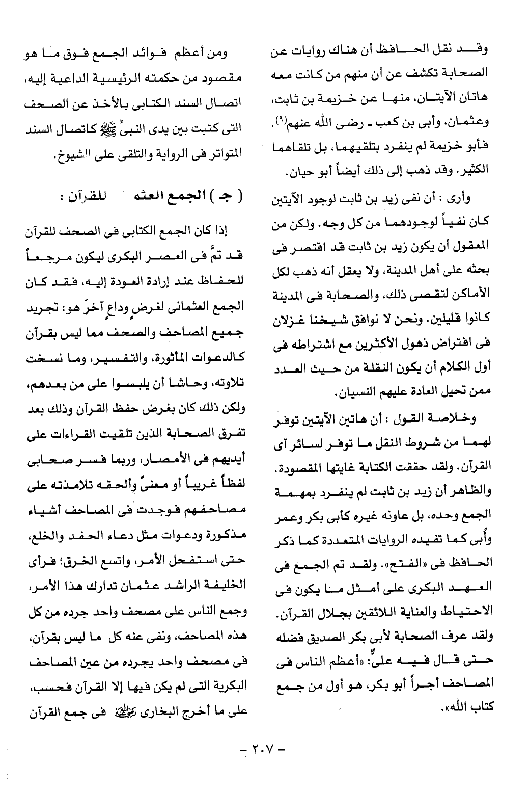وأرى: أن نفى زيد بن ثابت لوجود الآيتين كان نفيا لوجودهما من كل وجه. ولكن من المعقول أن يكون زيد بن ثابت قد اقتصر فى بحثه على أهل المدينة، ولا يعقل أنه ذهب لكل الأماكن لتقصى ذلك، والصحابة فى المدينة كانوا قليلين. ونحن لا نوافق شيخنا غزلان فى افتراض ذهول الأكثرين مع اشتراطه فى أول الكلام أن يكون النقلة من حيث العدد ممن تحيل العادة عليهم النسيان.