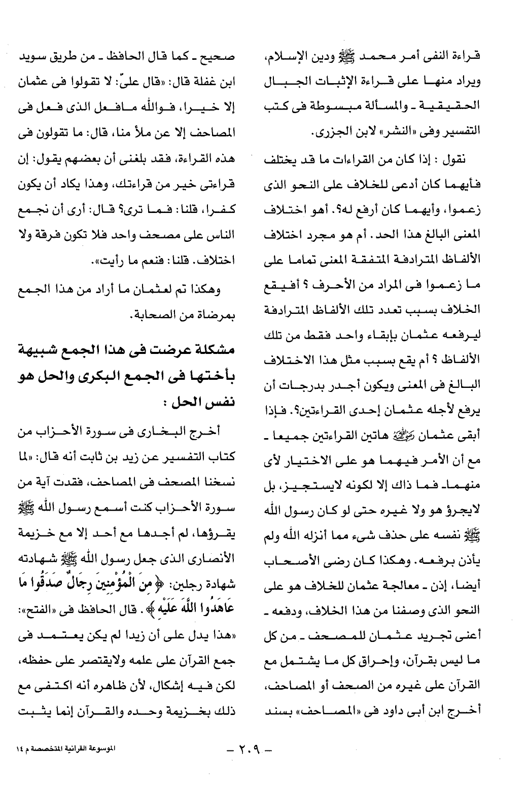 نقول: إذا كان من القراءات ما قد يختلف فأيهما كان أدعى للخلاف على النحو الذى زعموا، وأيهما كان أرفع له؟. أهو اختلاف المعنى البالغ هذا الحد. أم هو مجرد اختلاف الألفاظ المترادفة المتفقة المعنى تماما على ما زعموا فى المراد من الأحرف؟ أفيقع الخلاف بسبب تعدد تلك الألفاظ المترادفة ليرفعه عثمان بإبقاء واحد فقط من تلك الألفاظ؟ أم يقع بسبب مثل هذا الاختلاف البالغ فى المعنى ويكون أجدر بدرجات أن يرفع لأجله عثمان إحدى القراءتين؟. فإذا أبقى عثمان رضي الله عنه هاتين القراءتين جميعا- مع أن الأمر فيهما هو على الاختيار لأى منهما- فما ذاك إلا لكونه لا يستجيز، بل لا يجرؤ هو ولا غيره حتى لو كان رسول الله صلّى الله عليه وسلم نفسه على حذف شىء مما أنزله الله ولم يأذن برفعه. وهكذا كان رضى الأصحاب أيضا، إذن- معالجة عثمان للخلاف هو على النحو الذى وصفنا من هذا الخلاف، ودفعه- أعنى تجريد عثمان للمصحف- من كل ما ليس بقرآن، وإحراق كل ما يشتمل مع القرآن على غيره من الصحف أو المصاحف، أخرج ابن أبى داود فى «المصاحف» بسند صحيح- كما قال الحافظ- من طريق سويد ابن غفلة قال: «قال علىّ: لا تقولوا فى عثمان إلا خيرا، فو الله ما فعل الذى فعل فى المصاحف إلا عن ملأ منا، قال: ما تقولون فى هذه القراءة، فقد بلغنى أن بعضهم يقول: إن قراءتى خير من قراءتك، وهذا يكاد أن يكون كفرا، قلنا: فما ترى؟ قال: أرى أن نجمع الناس على مصحف واحد فلا تكون فرقة ولا اختلاف. قلنا: فنعم ما رأيت».