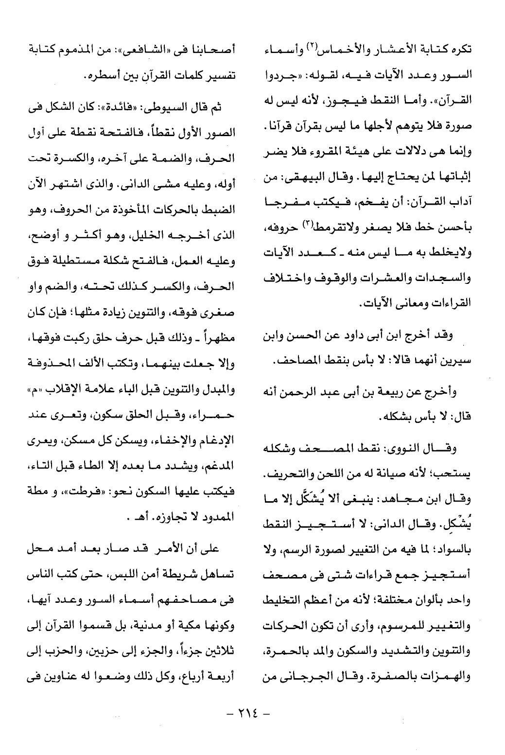 وقال ابن مجاهد: ينبغى ألا يشكّل إلا ما يشكل. وقال الدانى: لا أستجيز النقط بالسواد؛ لما فيه من التغيير لصورة الرسم، ولا أستجيز جمع قراءات شتى فى مصحف واحد بألوان مختلفة؛ لأنه من أعظم التخليط والتغيير للمرسوم، وأرى أن تكون الحركات والتنوين والتشديد والسكون والمد بالحمرة، والهمزات بالصفرة. وقال الجرجانى من أصحابنا فى «الشافعى»: من المذموم كتابة تفسير كلمات القرآن بين أسطره.