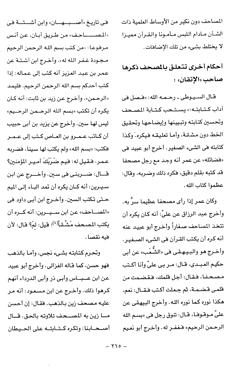 أحكام أخرى تتعلق بالمصحف ذكرها صاحب «الإتقان»: قال السيوطى- رحمه الله: «فصل فى آداب كتابته:» يستحب كتابة المصحف وتحسين كتابته وتبيينها وإيضاحها وتحقيق الخط دون مشقة، وأما تعليقه فيكره. وكذا كتابته فى الشيء الصغير. أخرج أبو عبيد فى «فضائله» عن عمر أنه وجد مع رجل مصحفا قد كتبه بقلم دقيق، فكره ذلك وضربه، وقال: